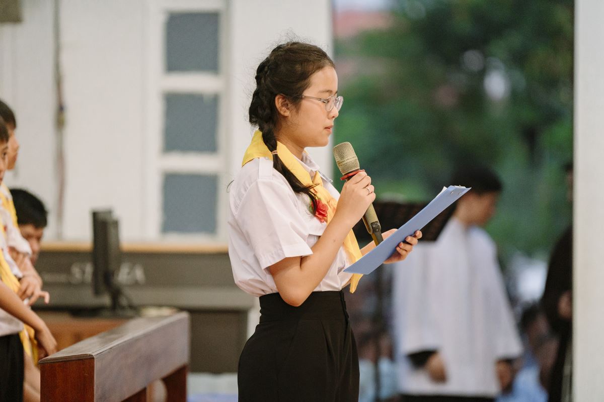 Trước khi kết thúc Thánh lễ, một em đại diện đã dâng lời tri ân tới Đức Cha, quý cha, quý thầy, quý thầy cô giáo lý viên và cộng đoàn. Đáp lại, Đức Cha Đaminh cũng dành ít phút để nhắn nhủ, khích lệ các em và chúc mừng giáo xứ.