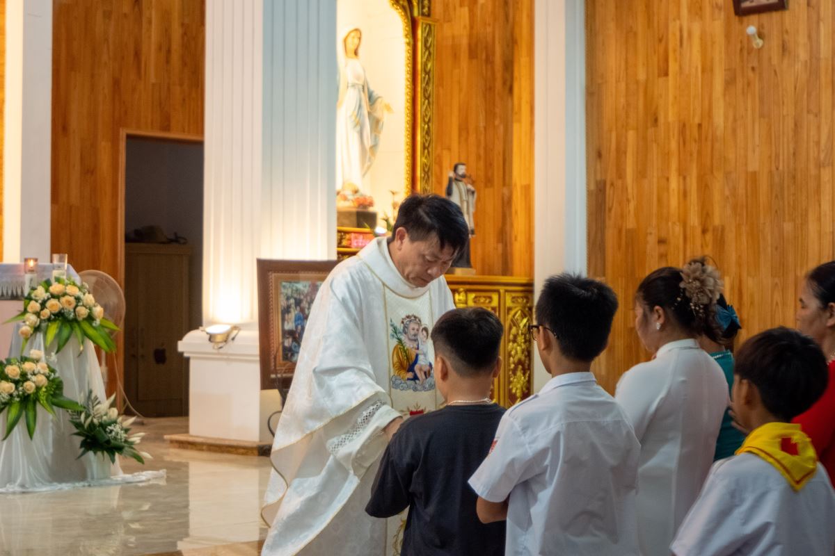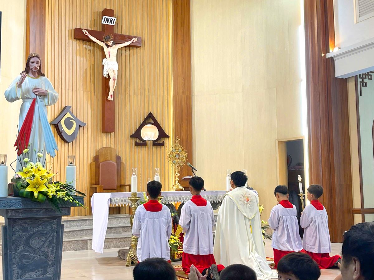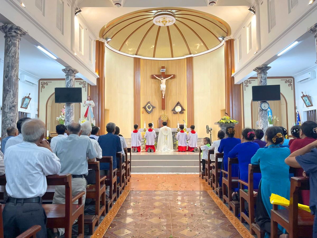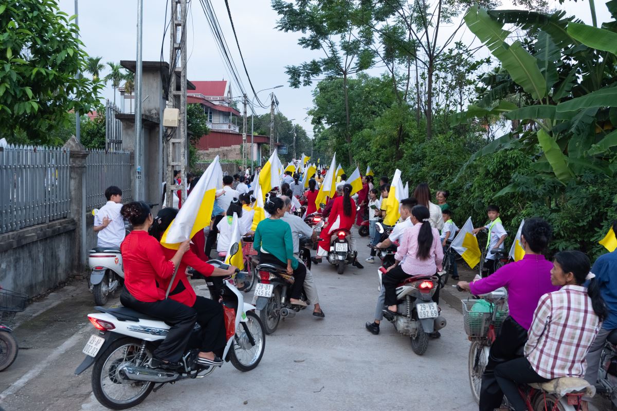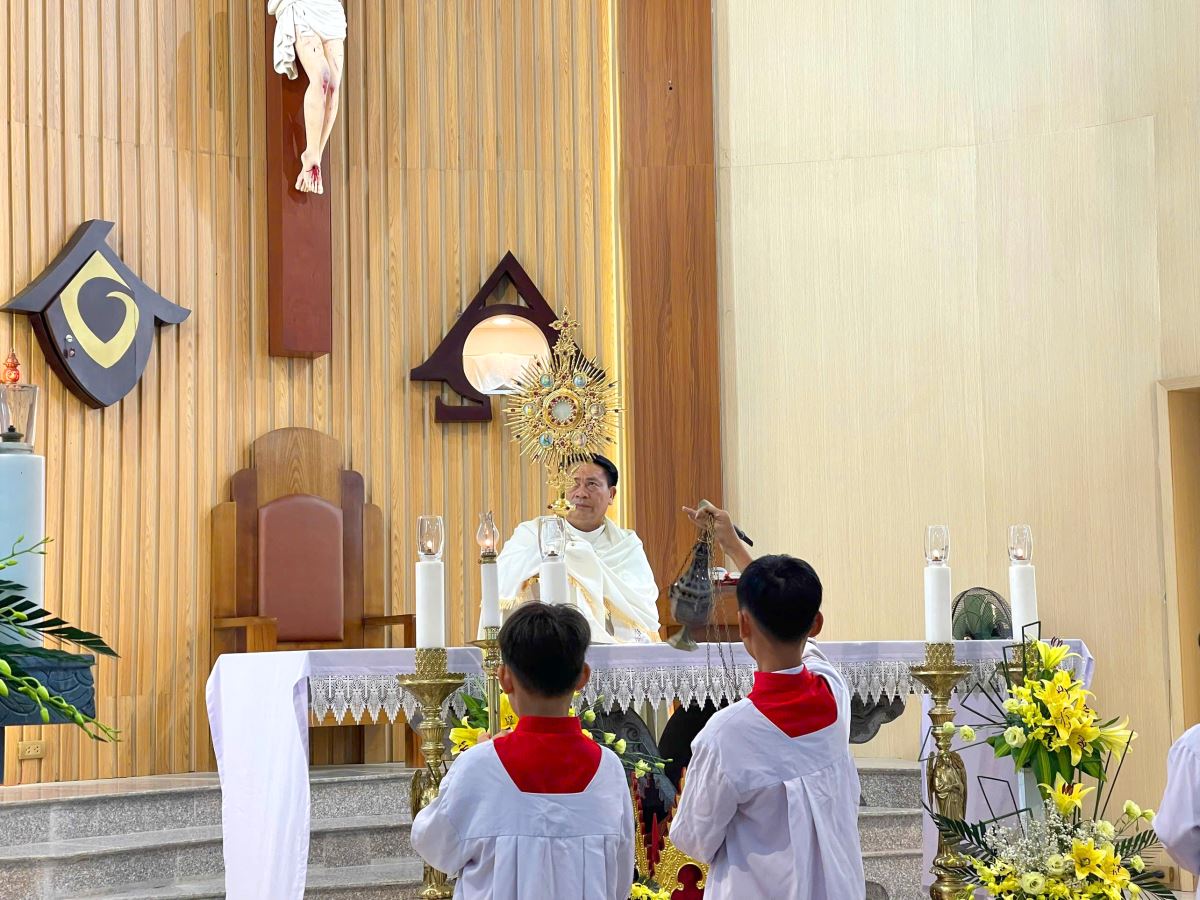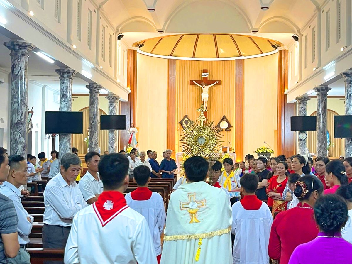 WGPHH - Chiều Chúa Nhật ngày 22.6.2025, trong không khí linh thiêng và sốt mến của toàn thể Giáo Hội hoàn vũ mừng lễ Mình và Máu Thánh Chúa Giêsu, giáo xứ Vĩnh Thọ đã long trọng cử hành Thánh lễ và cuộc rước cung nghinh Thánh Thể – một cuộc rước đầy trang nghiêm, sốt sắng, ghi dấu ấn sâu đậm trong tâm hồn mọi người tham dự. Đây cũng là lần đầu tiên giáo xứ tổ chức cung nghinh Thánh Thể bằng phương tiện giao thông.