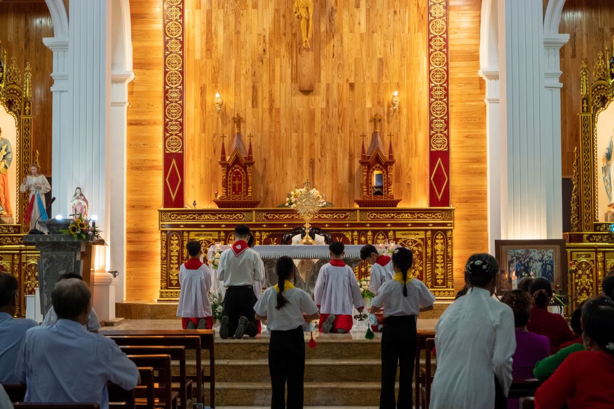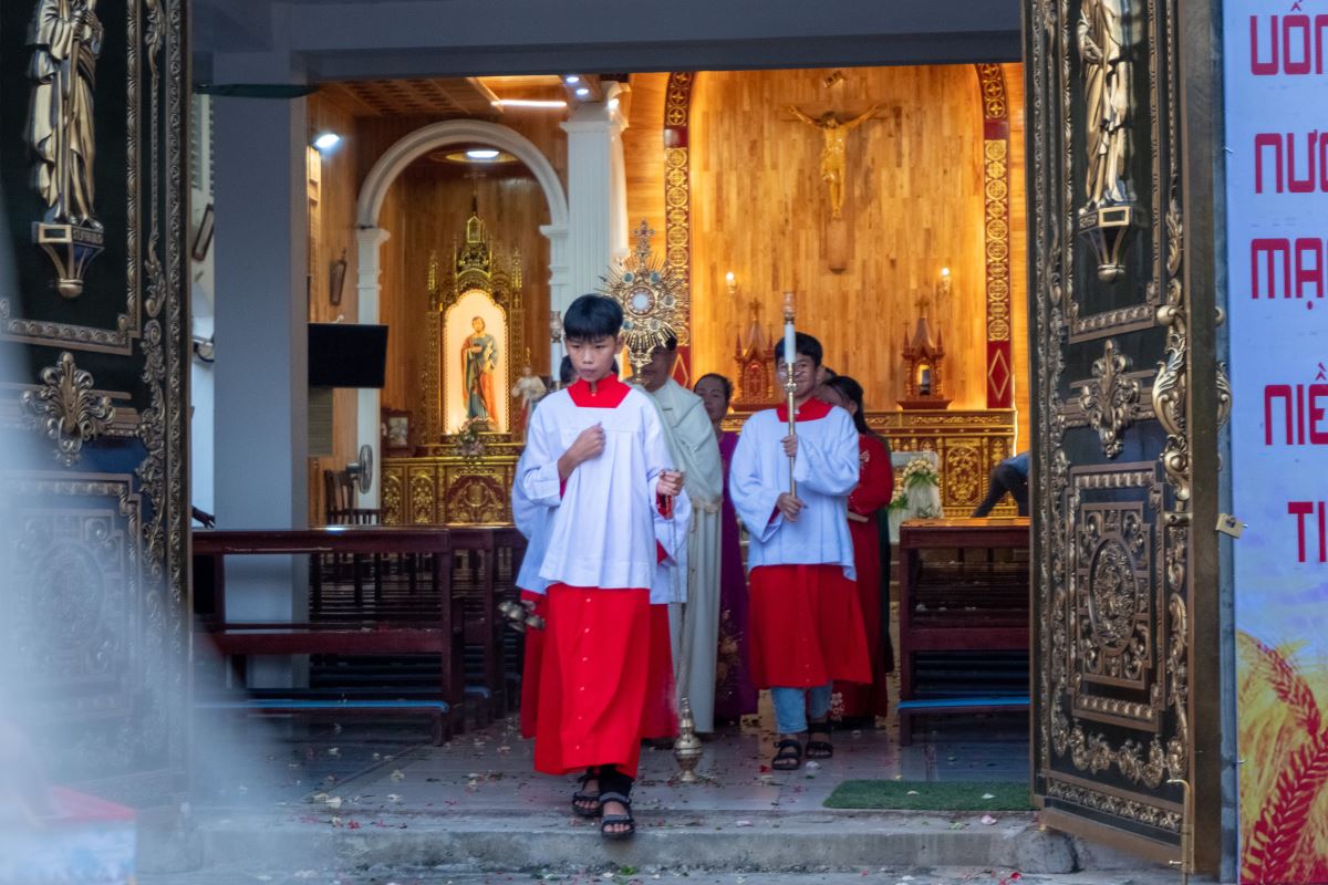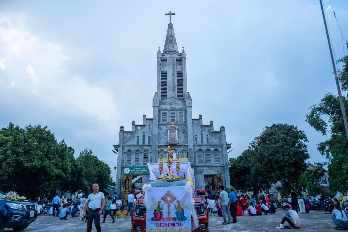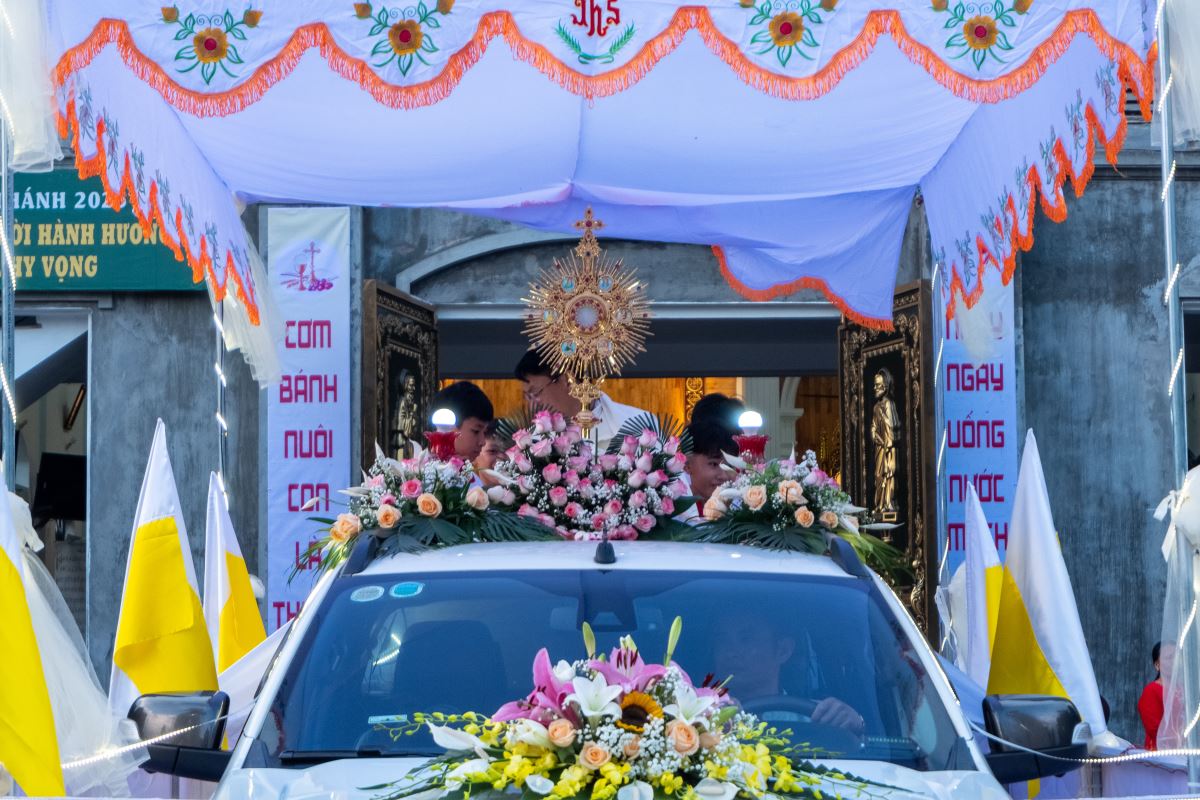 Cung nghinh Thánh Thể Chúa Giêsu Ngay sau Thánh lễ, Bánh Thánh vừa được truyền phép trong Thánh lễ được đặt trong hào quang rồi kiệu rước ra khỏi nhà thờ để giáo hữu “bày tỏ công khai lòng tin và lòng kính mến đối với nhiệm tích Thánh Thể”. Bà con giáo dân trong trang phục chỉnh tề, ánh mắt hướng về ngôi thánh đường – nơi khởi đầu của hành trình thiêng liêng hôm nay.