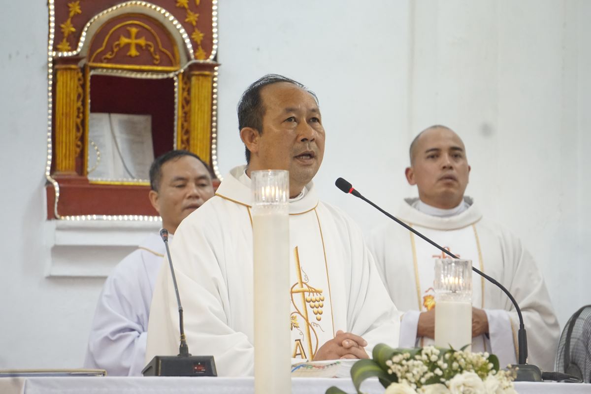 Cha Giuse Vũ Hồng Khanh giảng lễ. Khởi đi từ Tin Mừng theo thánh Gioan (Ga 16, 20-23a), cha mời gọi cộng đoàn khám phá sự hiện diện của Chúa trong đời sống qua đôi mắt đức tin. Cha nhấn mạnh rằng