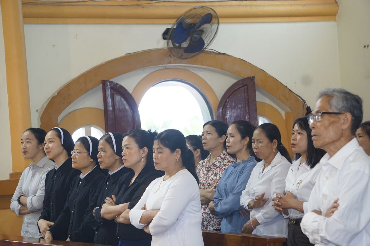 Vào nhà thờ, cộng đoàn tín hữu được Dì Maria Đinh Thị Nghi hướng dẫn tĩnh tâm, xét mình để dọn lòng tham dự Bí tích Hòa giải, một trong những điều kiện quan trọng để lãnh nhận Ơn toàn xá trong Năm Thánh.