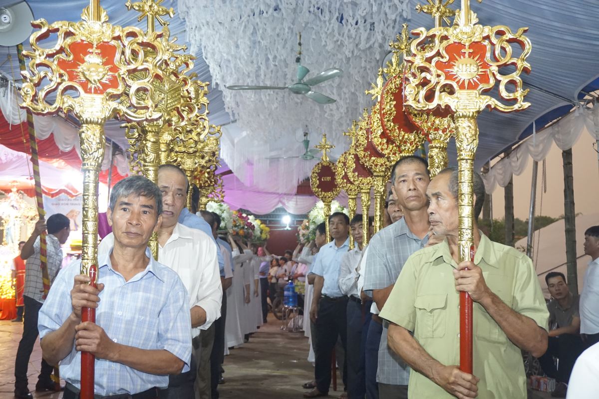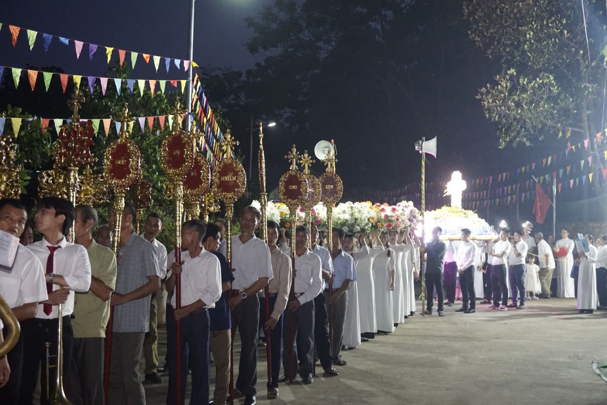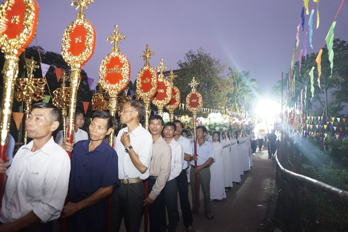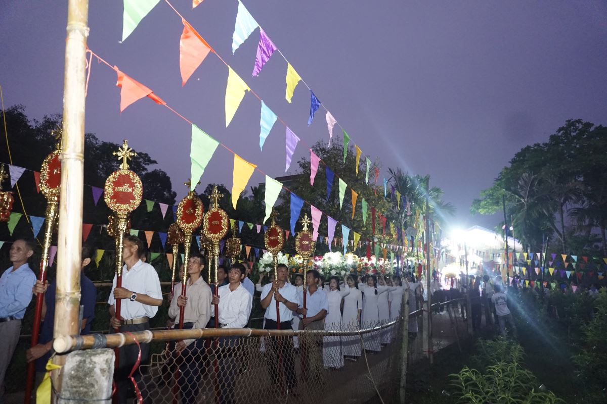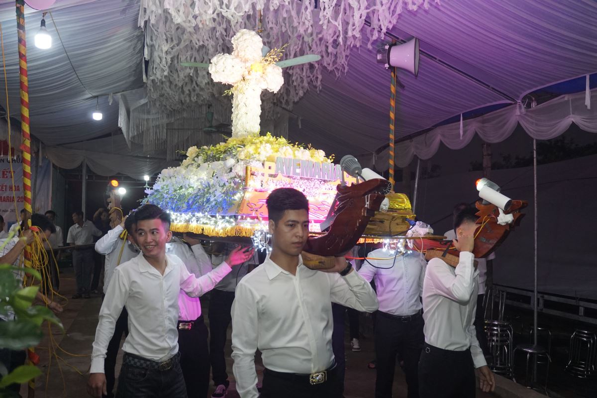 Đúng 18 giờ, với sự tham dự của toàn thể cộng đoàn trong Giáo xứ, cuộc rước kiệu chính thức khởi hành từ gia đình đặt địa điểm làm đèn kết hoa trong bầu khí linh thiêng, trật tự và đầy lòng sùng kính. Đoàn rước tiến về Nhà thờ Giáo xứ trong niềm hân hoan và tâm tình mến yêu Đức Mẹ.