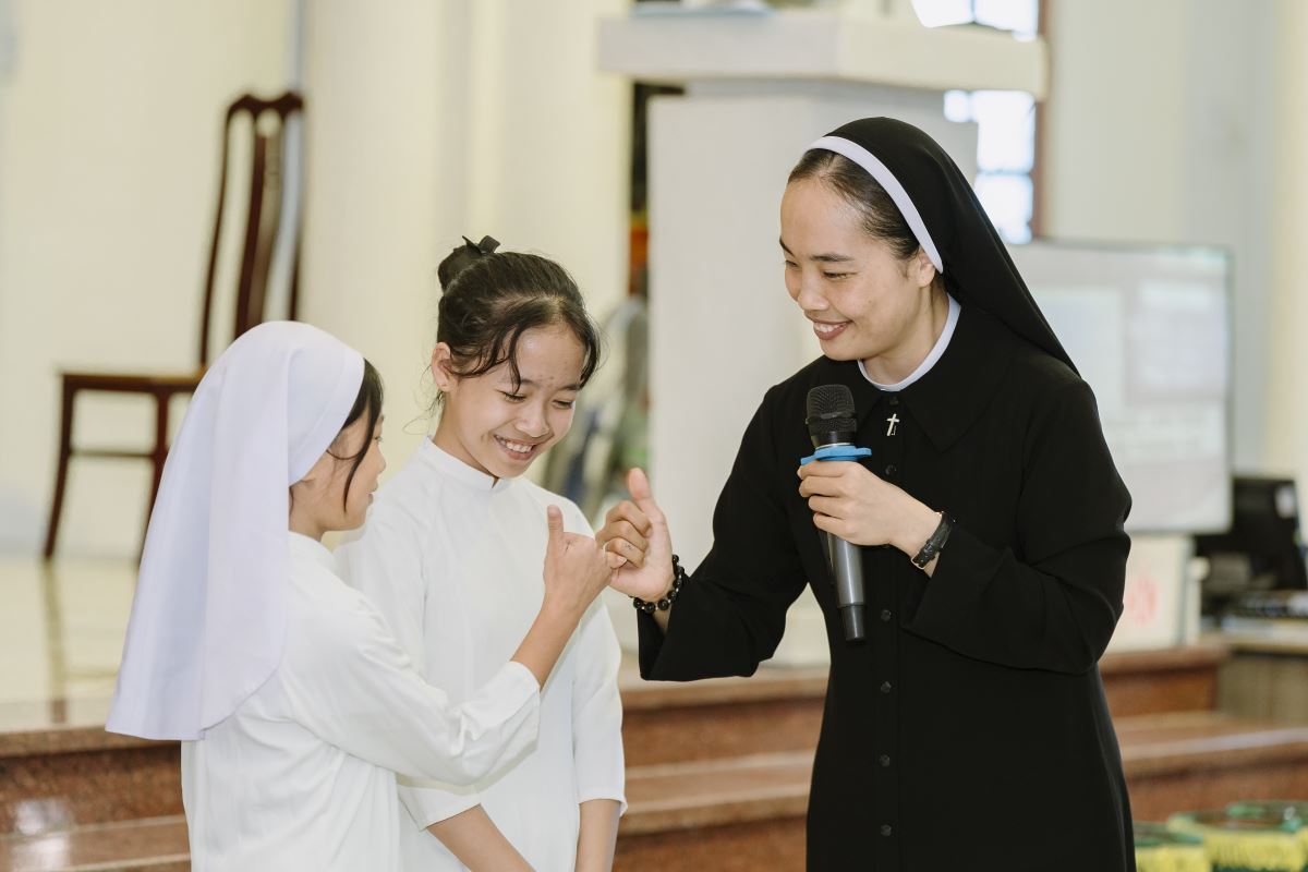 Sau Thánh lễ, bầu khí vui tươi tiếp tục được nối dài với phần sinh hoạt chung. Những câu hỏi Giáo lý – Kinh Thánh, những nụ cười giòn giã và niềm vui đơn sơ khi nhận phần quà từ các chị em đang tìm hiểu ơn gọi, đã biến sân nhà xứ thành một không gian chan hòa tình thân và niềm vui huynh đệ.