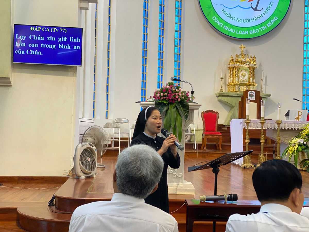 Đến 10g00, dì Têrêsa Nguyễn Thị Chiên hướng dẫn cộng đoàn ôn hát, giúp mọi người chuẩn bị tâm hồn và bước vào Thánh lễ một cách sốt sắng.