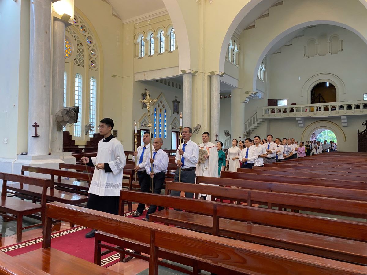 cha Giuse Đỗ Chung Quân chủ sự nghi thức hành hương tại hang đá Đức Mẹ. Sau đó, cộng đoàn tiến vào nhà thờ.