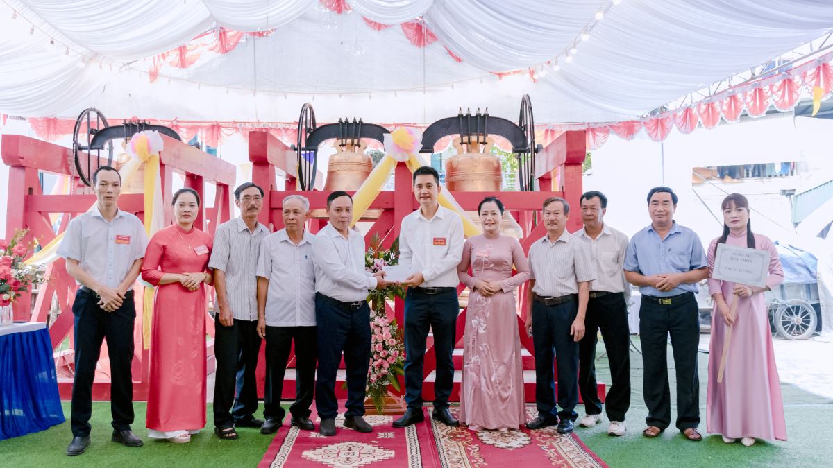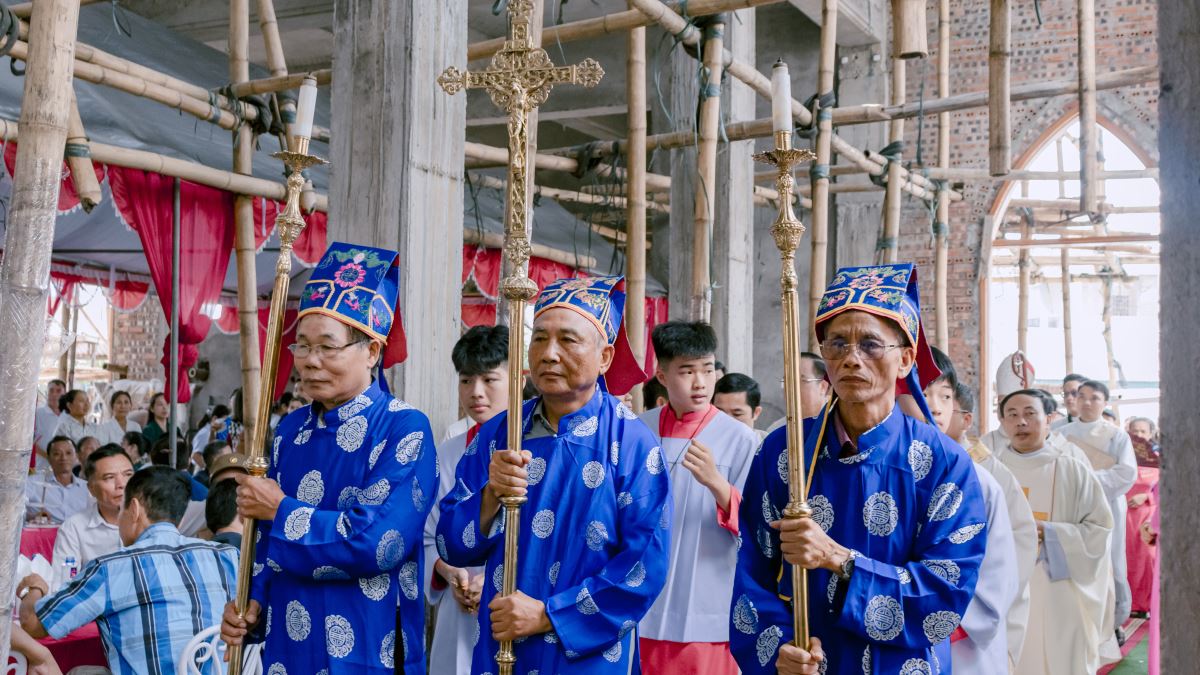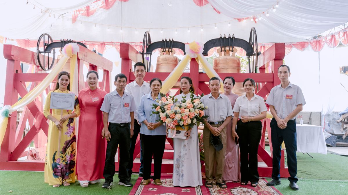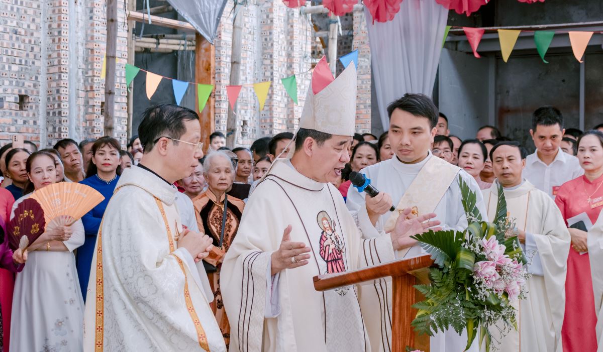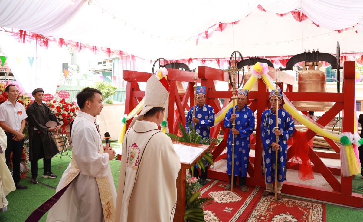 Đúng 9g00, đoàn rước đồng tế tiến vào khuôn viên ngôi thánh đường đang trong quá trình xây dựng. Tại nơi đặt tạm giá treo chuông và 03 quả chuông mới, Đức Cha Đaminh đã long trọng cử hành nghi thức làm phép, thánh hóa những quả chuông để từ nay âm vang của nó sẽ trở nên lời mời gọi cộng đoàn quy tụ cầu nguyện và nhắc nhớ mọi người sống trong tinh thần hiệp nhất yêu thương.