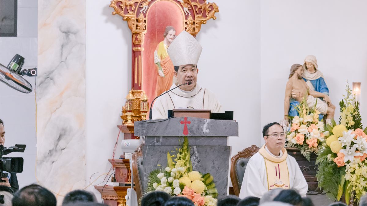 Trong bài giảng, khởi đi từ Tin Mừng theo Thánh Gioan với khung cảnh đồi Canvê, Đức cha Đaminh Hoàng Minh Tiến đã nhấn mạnh hình ảnh Mẹ Maria không phải là người phụ nữ yếu đuối, tuyệt vọng trước đau thương, nhưng Mẹ là người can đảm, kiên vững trong đức tin, mạnh mẽ trong đức cậy và nồng nàn trong đức mến.