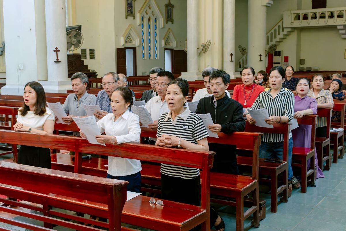 Đến 09g20, cộng đoàn quy tụ trong giờ chầu chung, sốt sắng hát kinh Te Deum. Cha phó Giuse Lê Thanh Nghị ban phép lành Mình Thánh Chúa, khép lại thời khắc tôn thờ Thánh Thể trước khi bước vào Thánh lễ.