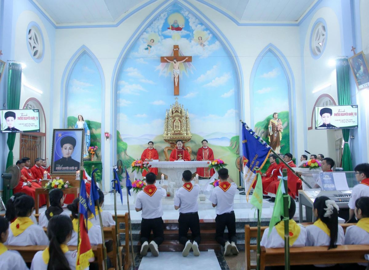 Chủ sự Thánh lễ là cha quản hạt Giuse Nguyễn Viết Hiệp. Mở đầu, ngài mời gọi cộng đoàn dâng lời tạ ơn Chúa, đồng thời cầu xin cho các huynh trưởng, dự trưởng biết noi gương vị thánh quan thầy Phêrô Nguyễn Khắc Tự, một thầy giảng vững chắc trong đức tin, nhiệt huyết trong lòng mến và trung kiên đến chết để làm chứng cho đức tin.