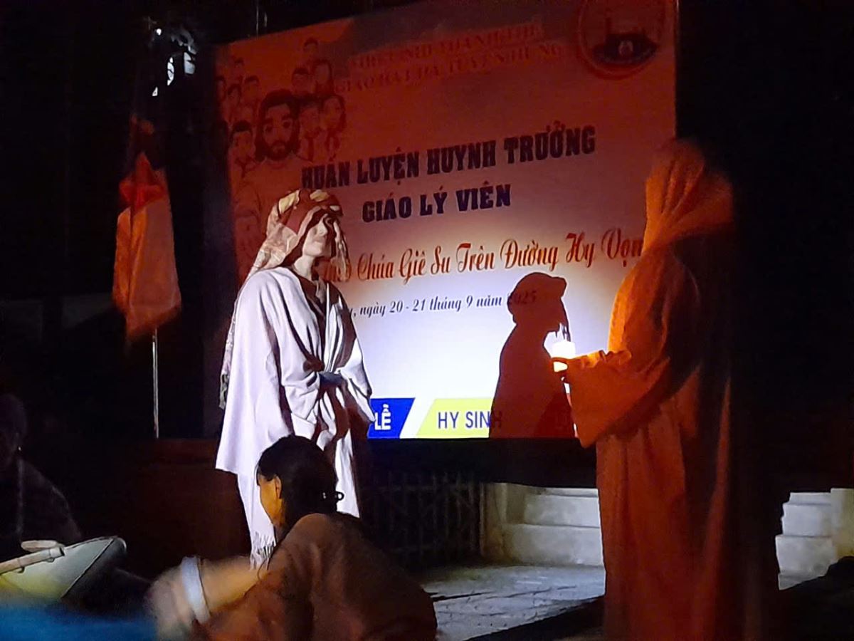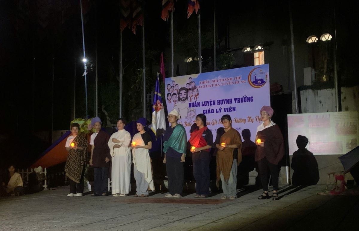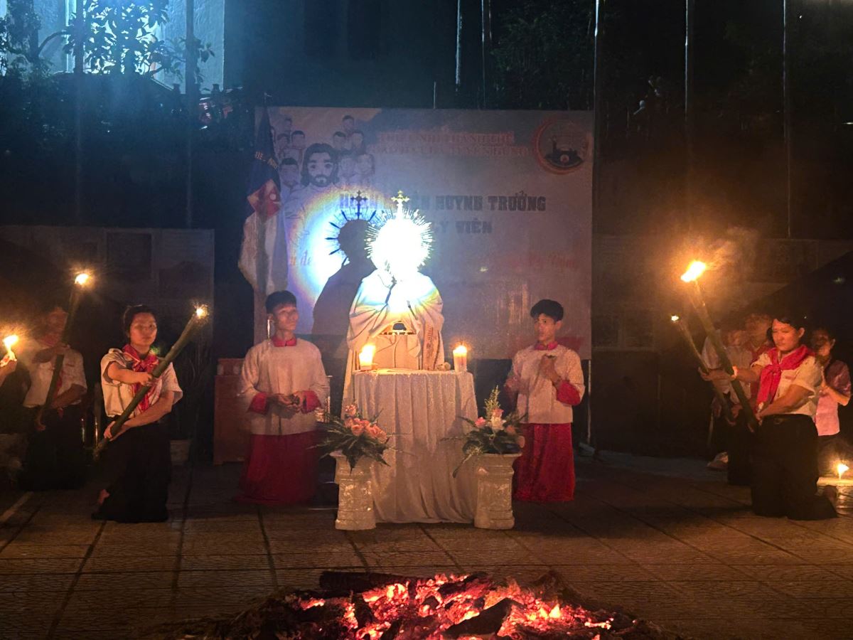 Vào tối ngày 27/9, các tham dự viên đã bước vào chương trình Lửa Thiêng Thánh Thể. Với chủ đề “Bước cùng Chúa Giêsu trên con đường Hy Vọng”, chương trình đã tái hiện những trang Tin Mừng, làm nổi bật các nội dung thực hành của khóa huấn luyện. Trong bầu khí linh thiêng, các tham dự viên như được dẫn bước vào khung cảnh Thánh Kinh, sống lại những câu chuyện Tin Mừng đầy sức sống. Cao điểm là giây phút cùng nhau quây quần bên Chúa Giêsu Thánh Thể, với những ánh lửa bập bùng trong đêm tối, để trái tim mỗi người bừng cháy niềm tin yêu, hy vọng và ơn gọi phục vụ.