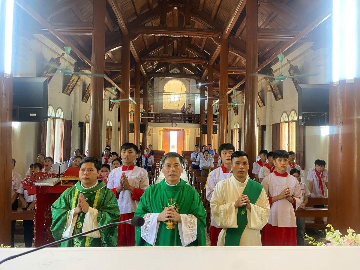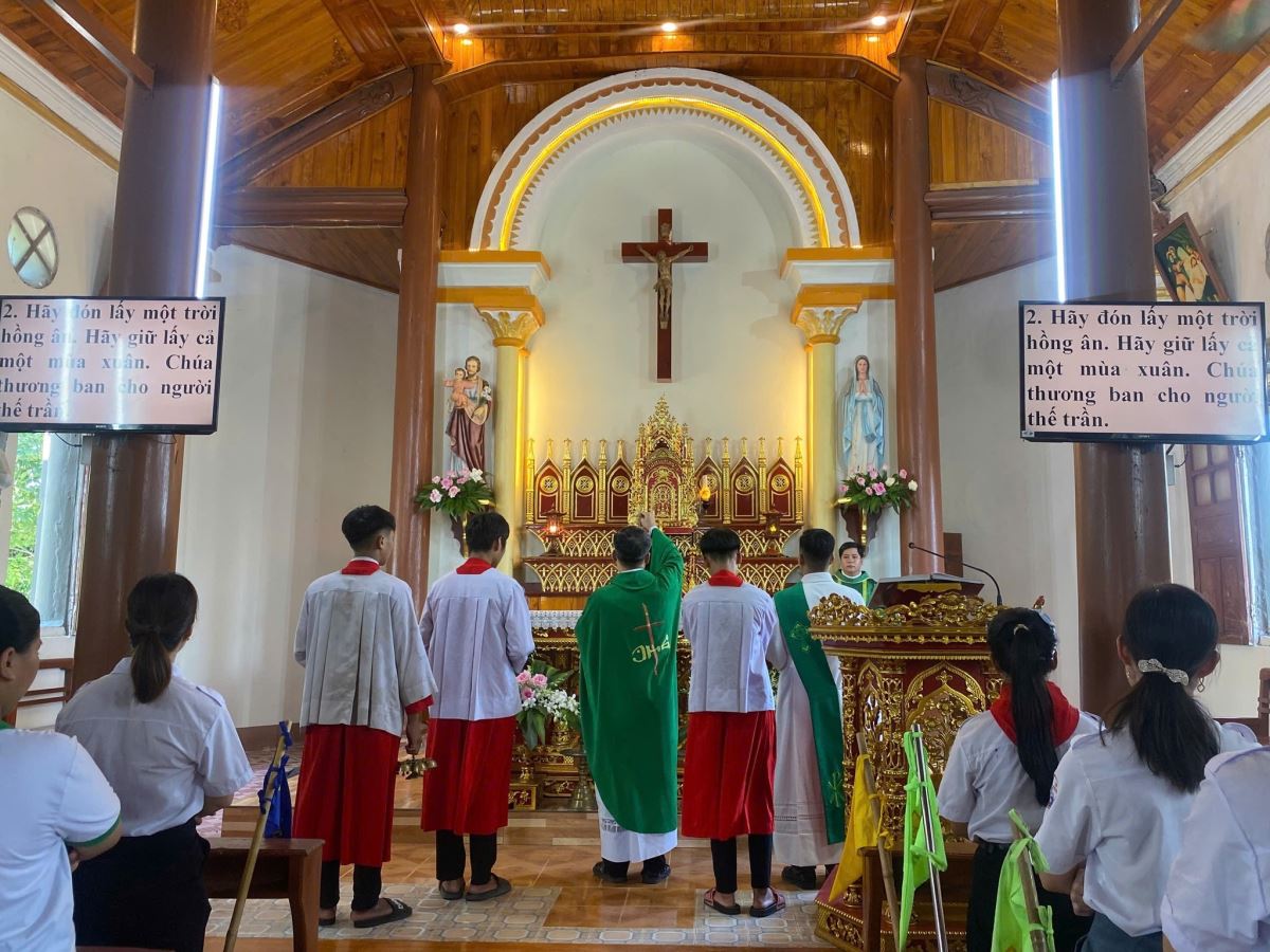 Ngay sau đó, 15g00 cộng đoàn bước vào Thánh lễ khai mạc – đỉnh cao của ngày sống. Cha Giuse Đỗ Công Tiếu chủ tế, mời gọi mọi người cùng tạ ơn Chúa và phó thác hành trình huấn luyện cho Chúa. Đồng tế, Cha Gioan Vũ Ân chia sẻ với tham dự viên rằng: “Chúa Giêsu dạy chúng ta biết tín thác nơi Thiên Chúa, sống quảng đại hy sinh để làm chứng cho Tin Mừng. Người Huynh trưởng – Giáo lý viên được mời gọi bước theo Chúa trên con đường hy vọng, không tìm vinh quang cho mình nhưng đặt trọn niềm tin nơi Chúa, để rồi qua sự phục vụ âm thầm, chính Chúa mang lại hoa trái là hạnh phúc Nước Trời cho các em thiếu nhi.”