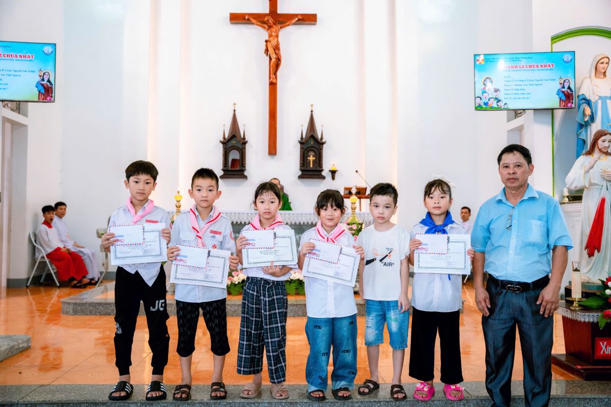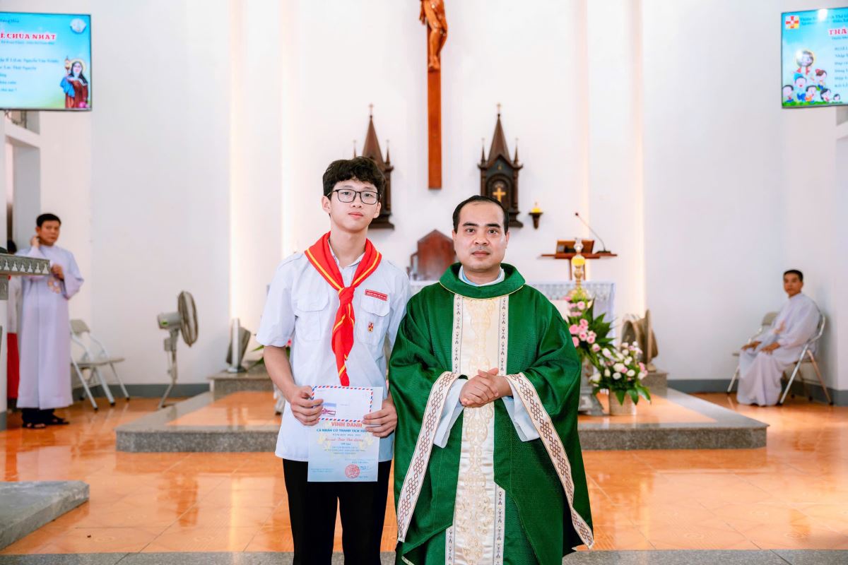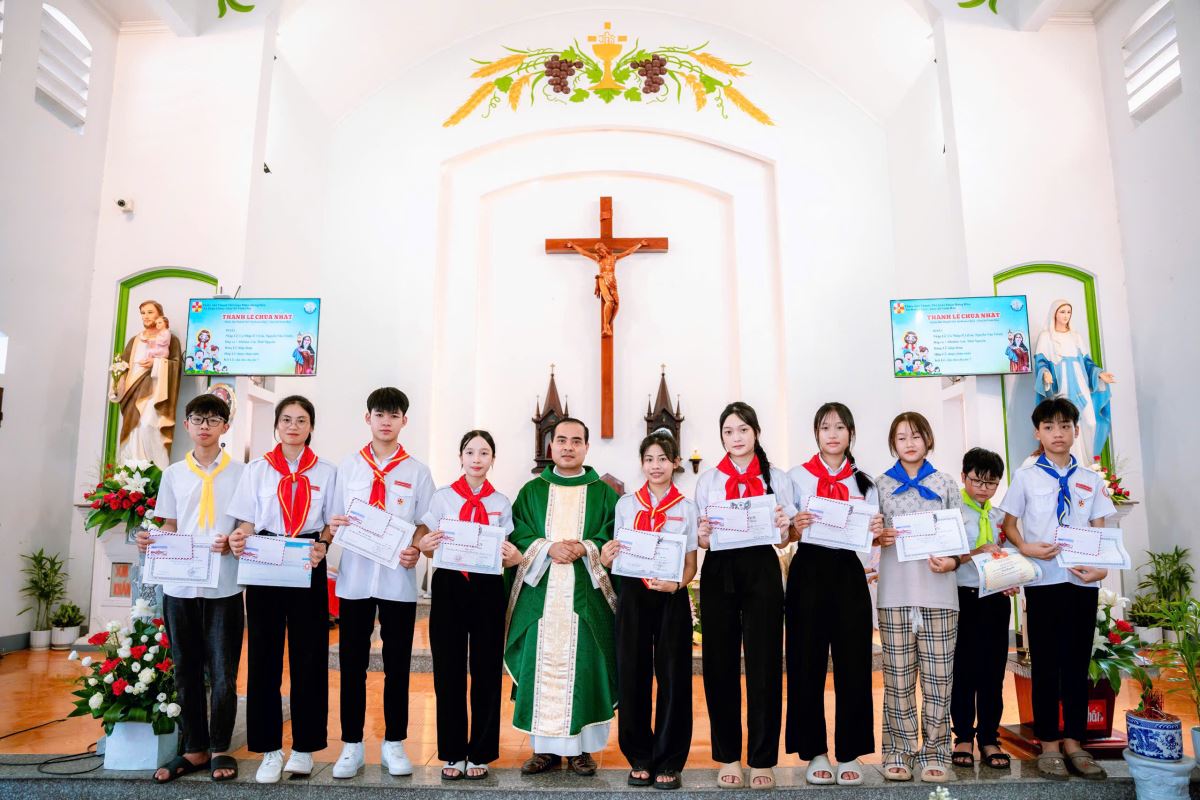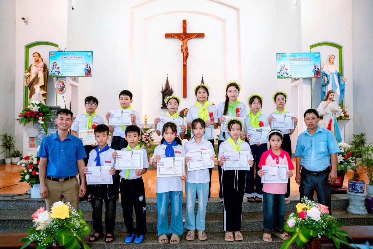 Mở đầu chương trình, Xứ đoàn đã long trọng trao phần thưởng tuyên dương các em học sinh giỏi và xuất sắc năm học 2024–2025. Những món quà nhỏ bé nhưng đầy ý nghĩa đã trở thành lời khích lệ, cổ vũ các em không ngừng nỗ lực học tập và rèn luyện. Tiếng pháo tay giòn giã vang lên, chan chứa niềm vui và niềm tự hào của cộng đoàn.