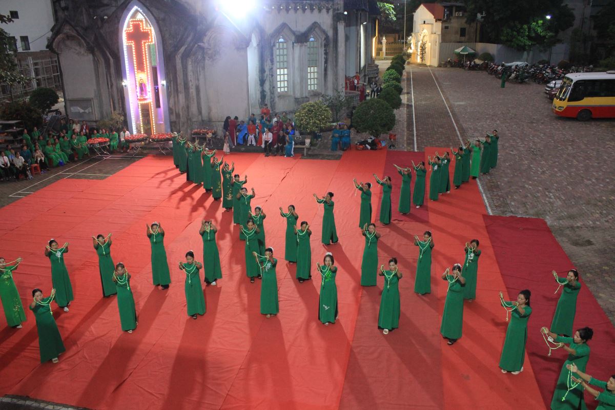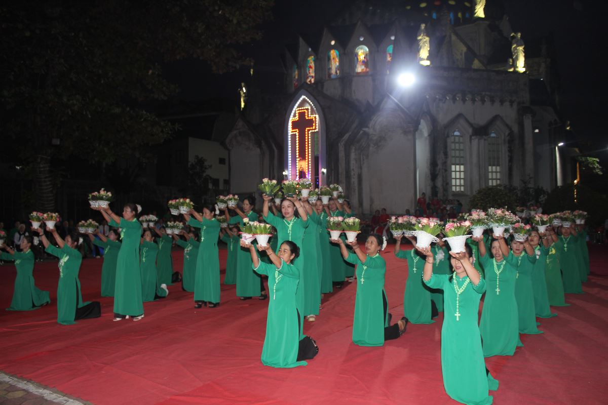 Đến 17g00 là chương trình dâng hoa kính Đức Mẹ Mân Côi. Từng đội hoa tiến dâng lên Mẹ những đóa hoa tươi, ánh nến và tràng chuỗi Mân Côi. Các đội hoa mang sắc phục và phong cách riêng, nhưng cùng chung tâm tình tạ ơn, ca ngợi và xin Mẹ cầu bầu cho Giáo Hội, cộng đoàn và từng gia đình.