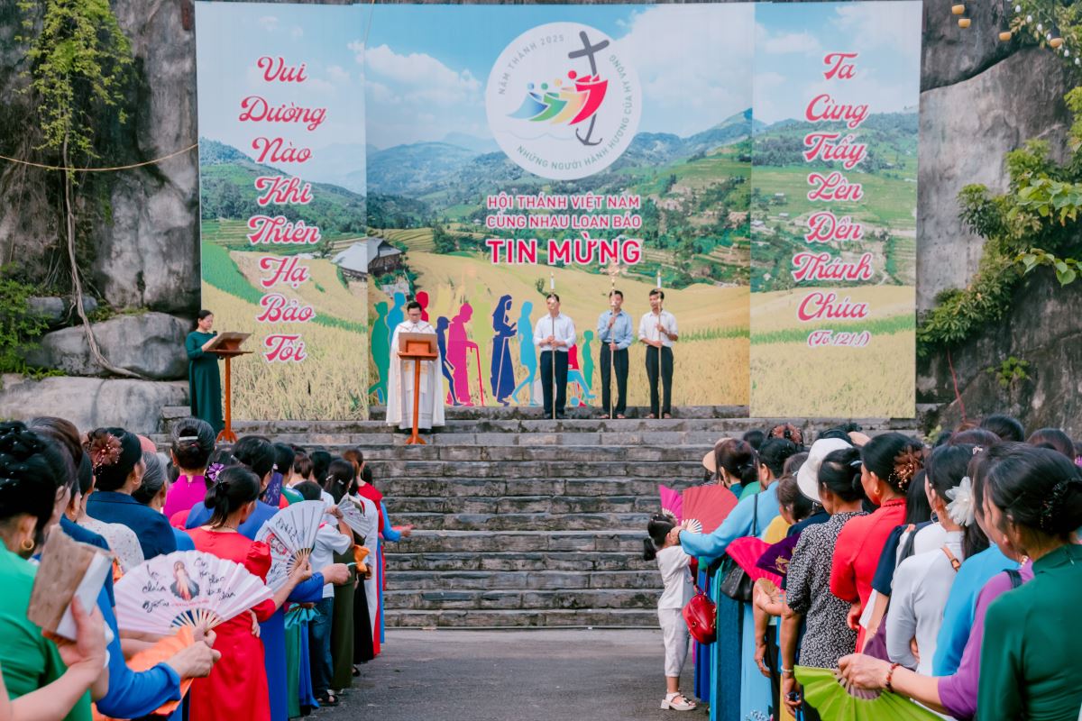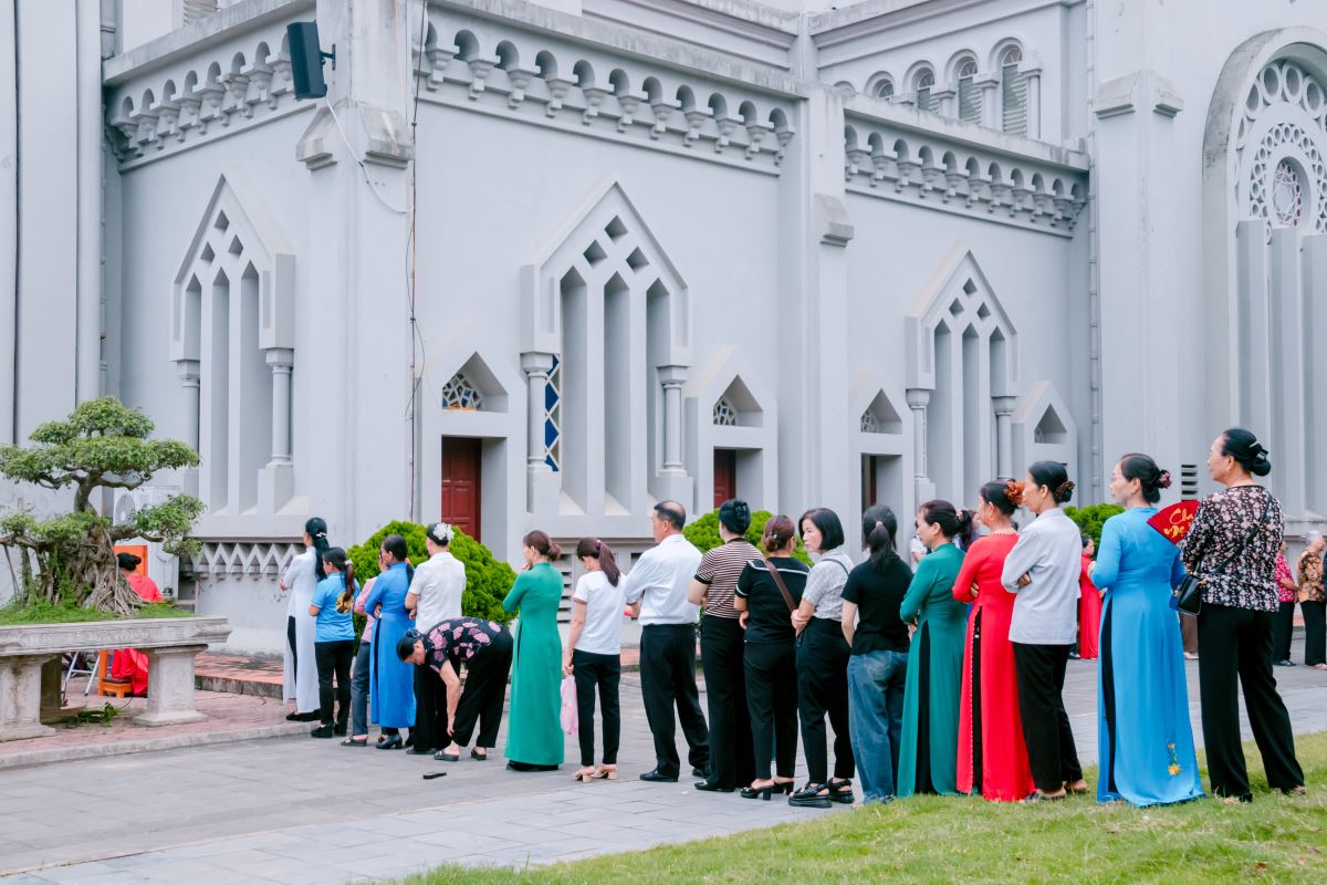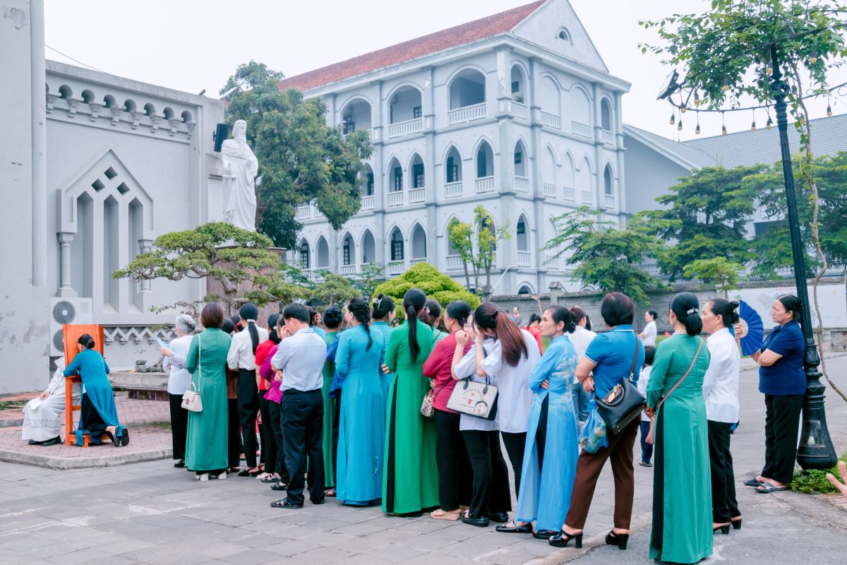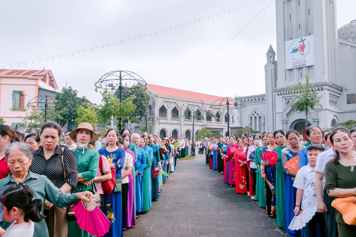 Sau phần nghi thức đầu ngày, đoàn hành hương tiến vào bên trong nhà thờ để tiếp tục chương trình. Đoàn hành hương tiến vào nhà thờ |