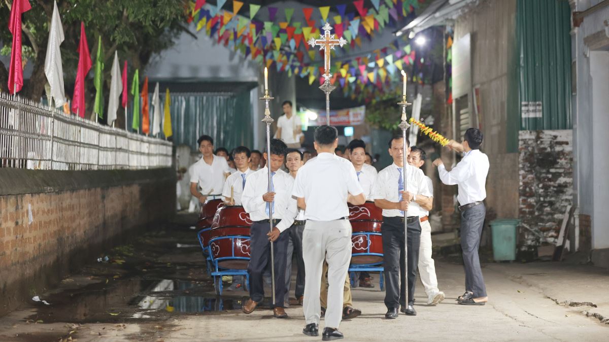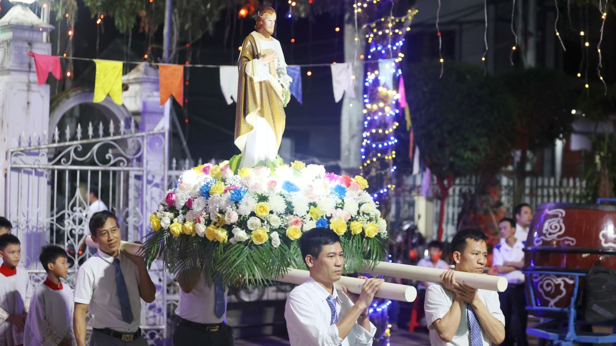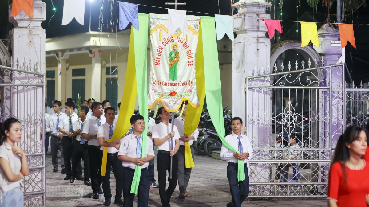 Thánh lễ mừng kính Thánh Giuse Thợ, bổn mạng của hội Giuse được cử hành vào lúc 20g00 cùng ngày. Trước khi bước vào thánh lễ, toàn thể hội viên và cộng đoàn xếp hàng đôi, cầm trên tay những ngọn nến sáng lung linh và những bông hoa tinh khiết long trọng rước Thánh giá, kiệu tượng Thánh Giuse vào trong nhà thờ trong tiếng nhạc rộn rã của dàn kèn đồng và tiếng trống cùng nhau cất vang bài hát ca ngợi Thánh Giuse quan thầy, lòng tràn ngập niềm vui khôn tả.