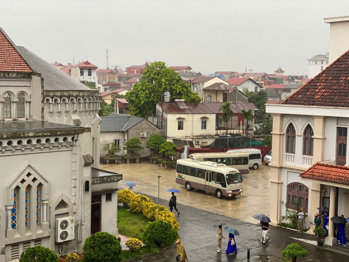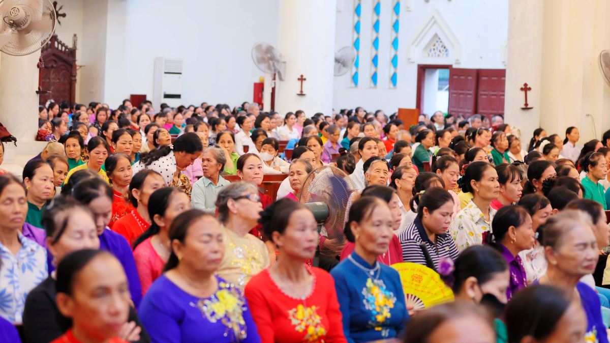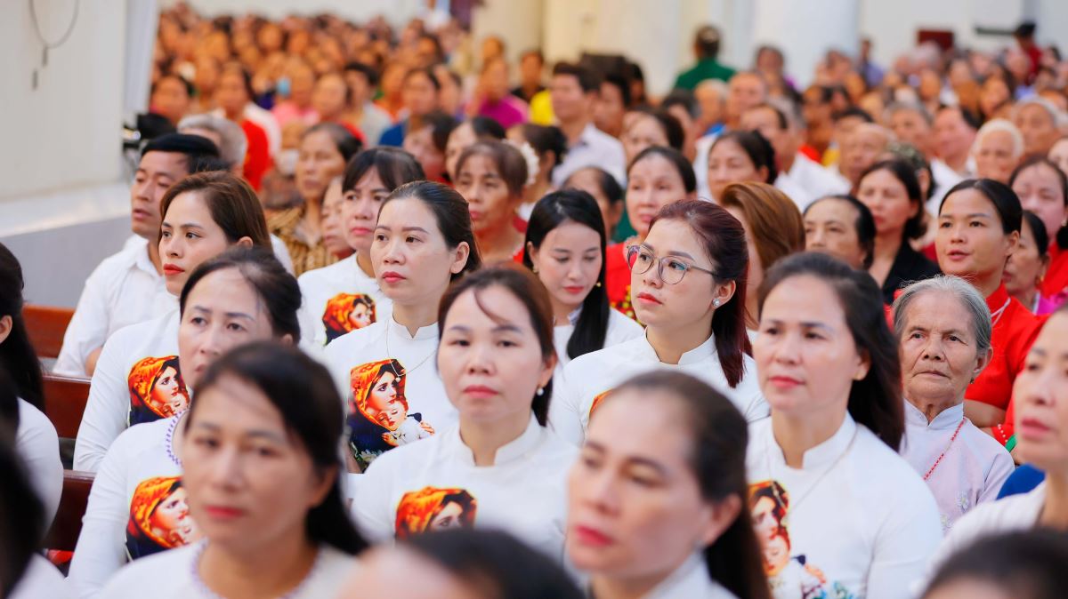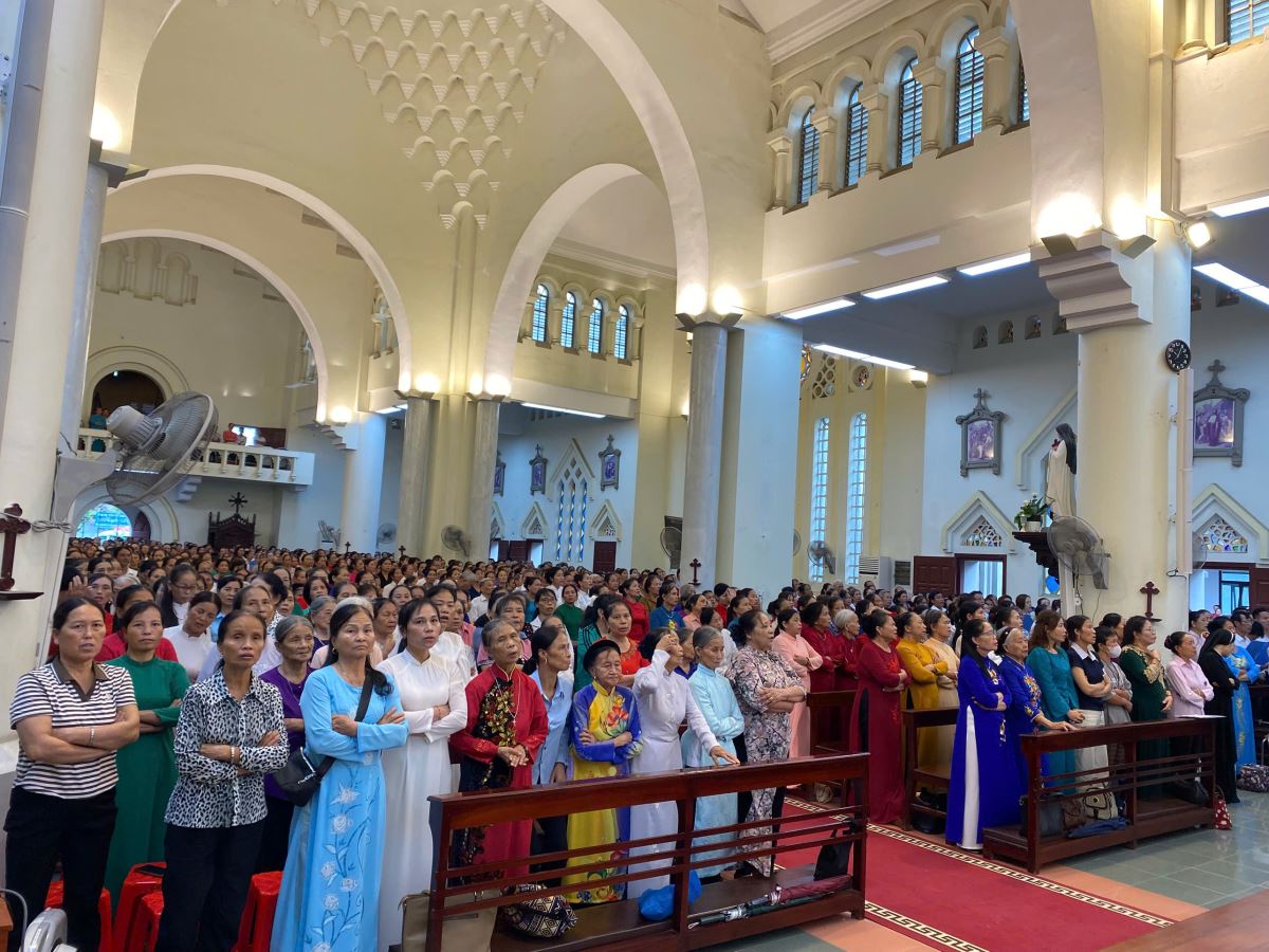 Dù chịu ảnh hưởng của hoàn lưu bão số 11 Matmo, nhưng ngay từ sớm, từng đoàn xe hành hương vẫn nối đuôi nhau tiến về Nhà thờ Chính Tòa. Giữa cơn mưa, ai nấy cũng có thể cảm nhận được lòng sốt mến, niềm tín thác và tình yêu sâu đậm của các hội viên dành cho Đức Maria Mân Côi.