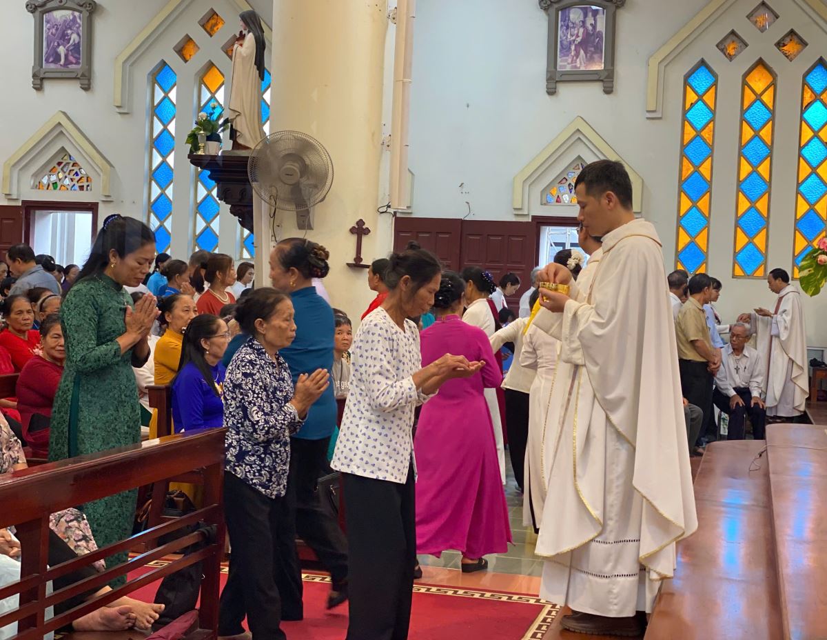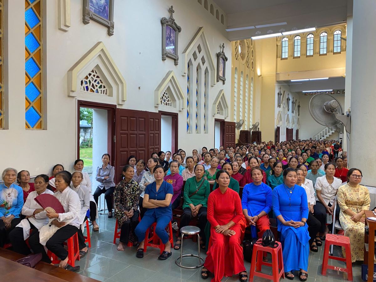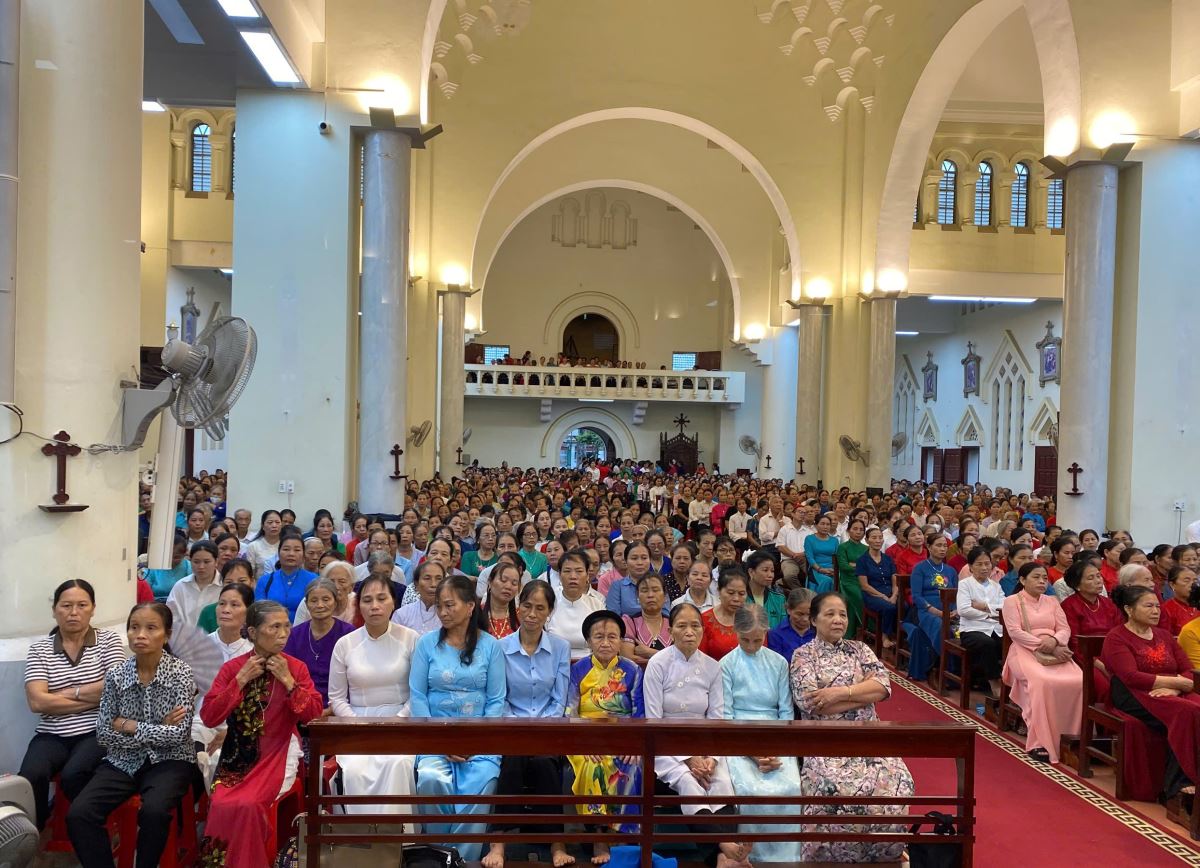 Dù chịu ảnh hưởng của hoàn lưu bão số 11 Matmo, nhưng ngay từ sớm, từng đoàn xe hành hương vẫn nối đuôi nhau tiến về Nhà thờ Chính Tòa. Giữa cơn mưa, ai nấy cũng có thể cảm nhận được lòng sốt mến, niềm tín thác và tình yêu sâu đậm của các hội viên dành cho Đức Maria Mân Côi.