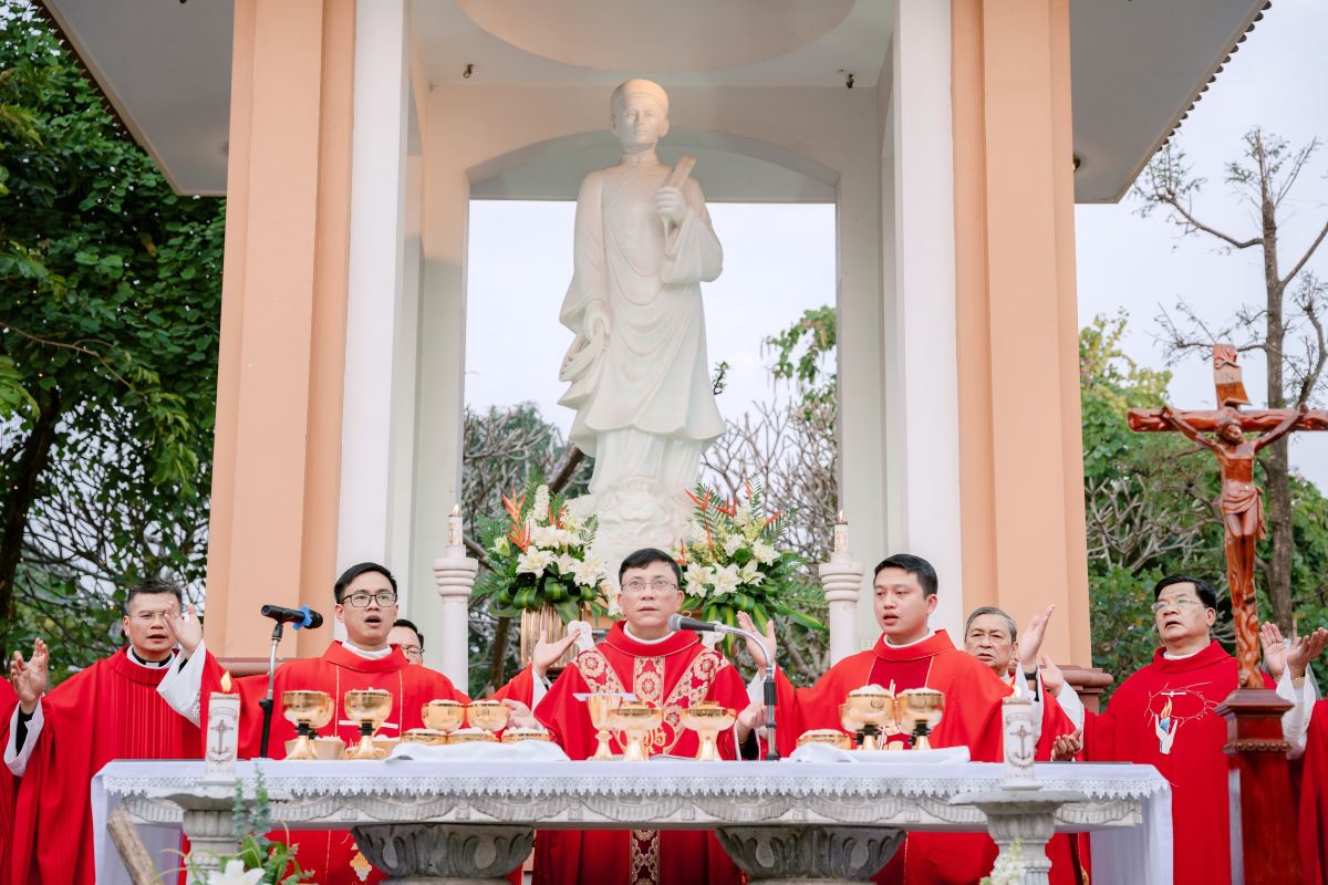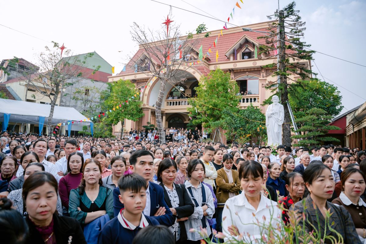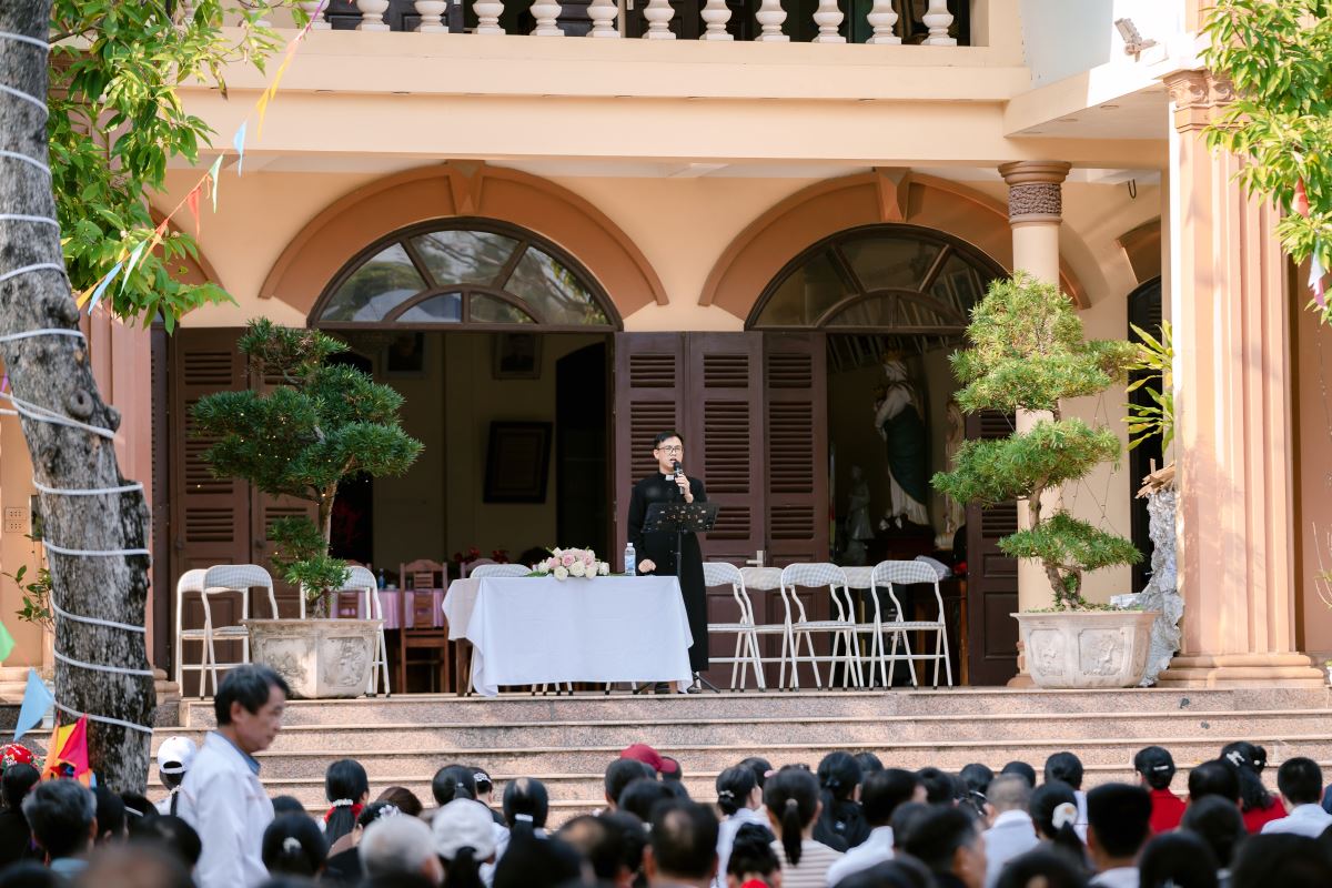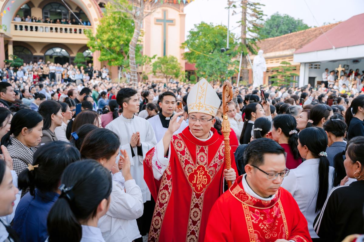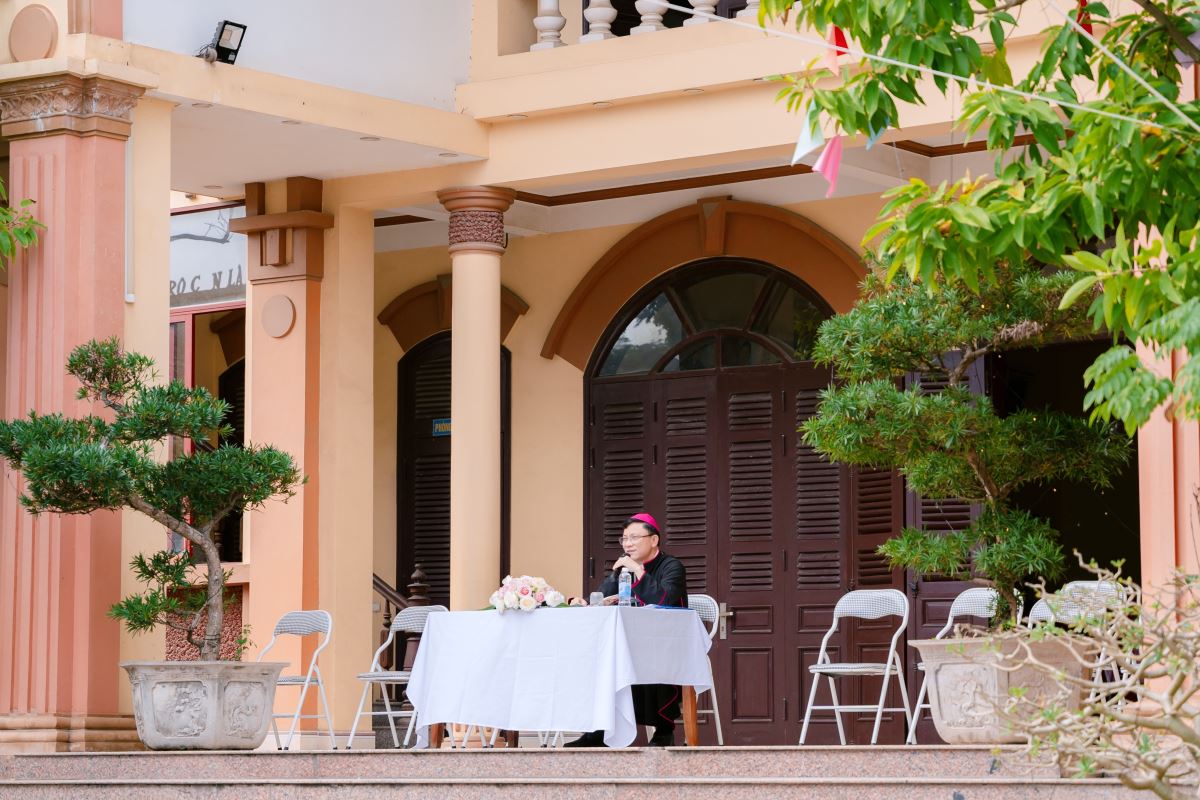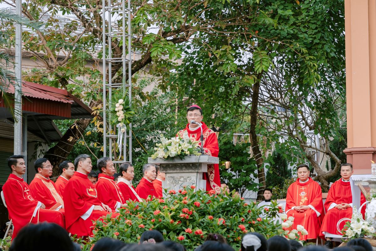 Trong bài giảng, Đức cha làm nổi bật nhân đức khôn ngoan của Thánh Phêrô Vũ Văn Truật – vị thầy giảng trẻ tuổi đã hiến trọn đời mình cho Thiên Chúa. Sự khôn ngoan ấy không chỉ thể hiện nơi lời nói đầy xác tín khi ngài dùng miệng lưỡi để làm chứng cho chân lý, nhưng còn được biểu lộ qua những chọn lựa dứt khoát trong đời sống, khi thánh nhân chọn Chúa làm phần gia nghiệp duy nhất của mình. Đỉnh cao của sự khôn ngoan ấy chính là lòng trung tín đến cùng, được thể hiện qua việc can đảm vác thánh giá và sẵn sàng hy sinh mạng sống vì đức tin. Từ gương sáng của thánh bổn mạng, Đức cha mời gọi cộng đoàn, cách riêng các giáo lý viên hôm nay biết chọn Chúa làm lẽ sống, trung thành với đức tin và can đảm sống Tin Mừng, để trở nên những chứng nhân sống động cho thế hệ trẻ.