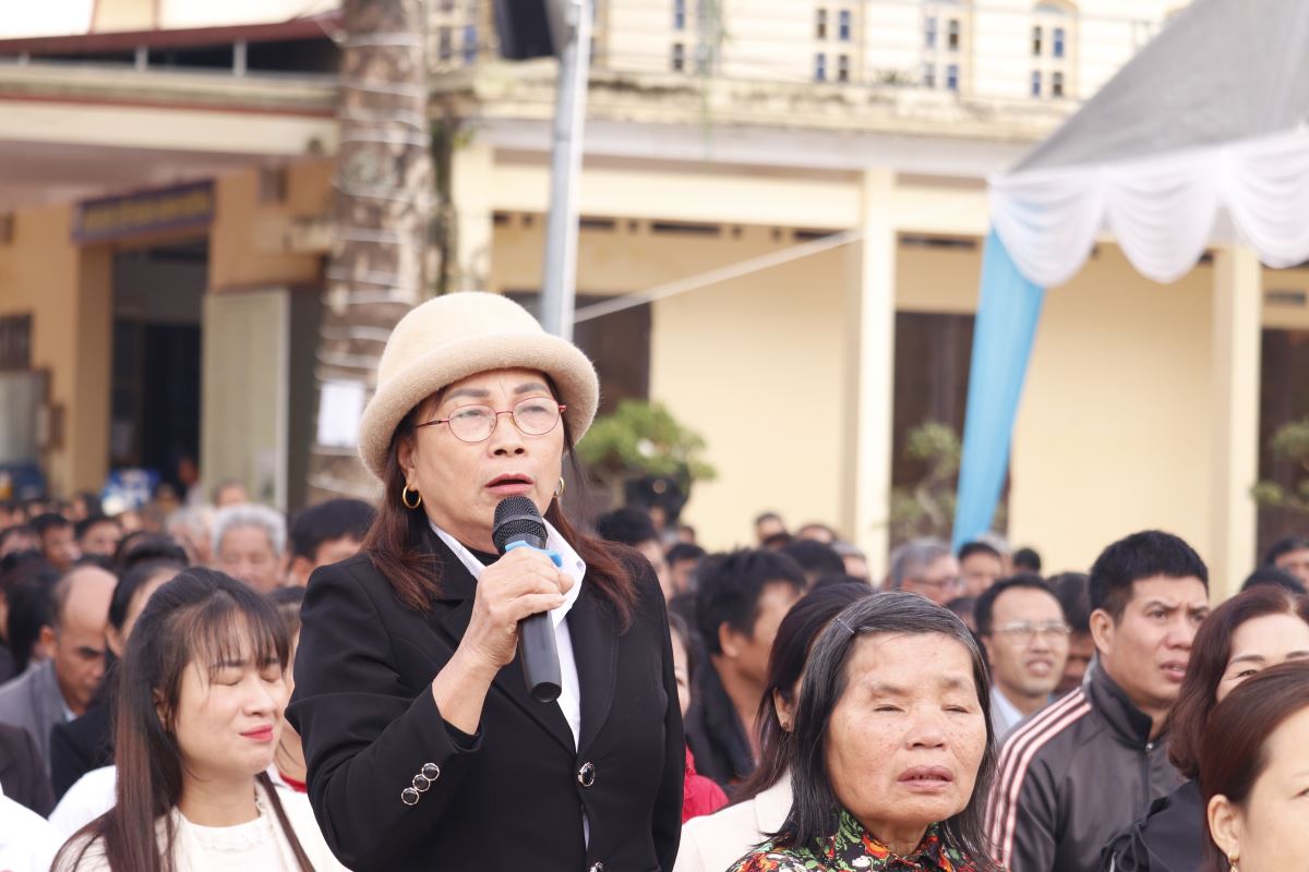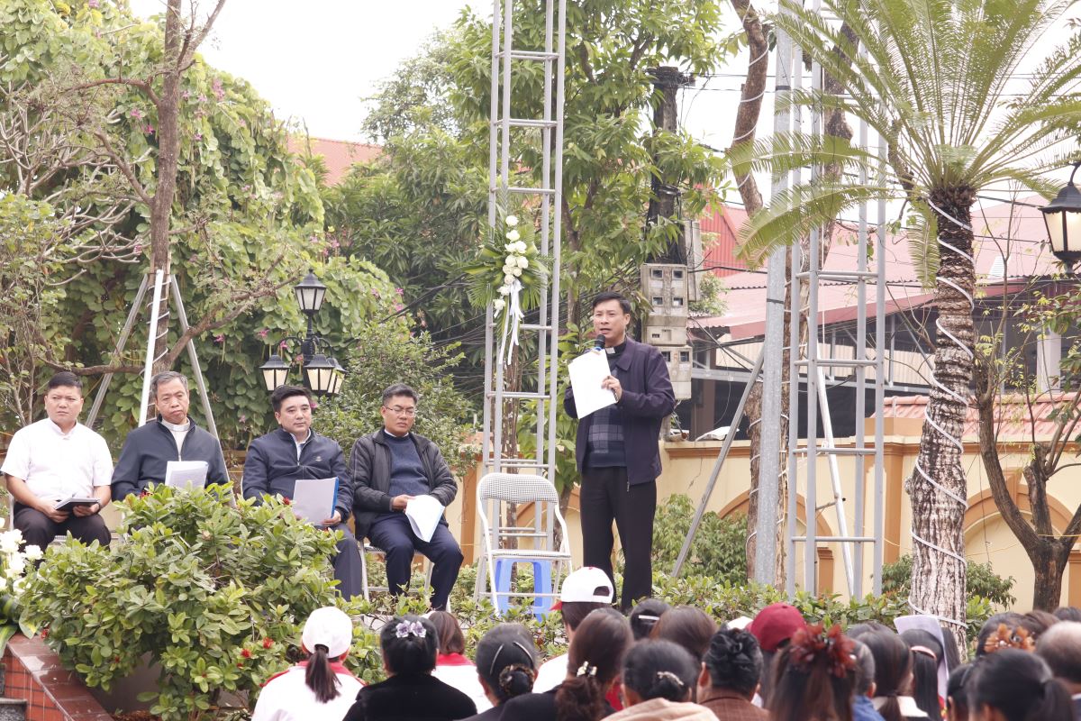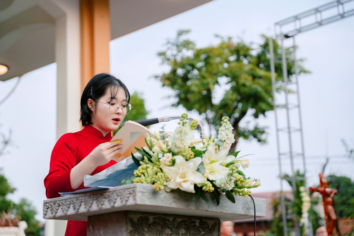 Sau lời nguyện hiệp lễ, cha Giuse Dương Quốc Chí, Phó Chủ tịch UBGLĐT, đại diện bày tỏ tâm tình tri ân quý Đức cha, quý cha, quý tu sĩ và toàn thể cộng đoàn đã luôn quan tâm, đồng hành và nâng đỡ công tác giáo lý của Giáo phận. Cách riêng, cha gửi lời cảm ơn chân thành đến các giáo lý viên, những người đang âm thầm dấn thân và bền bỉ phục vụ trong sứ vụ gieo mầm đức tin nơi các thế hệ trẻ. Cha cũng bày tỏ lòng tri ân đến Giáo hạt và Giáo xứ đăng cai đã chu đáo sắp xếp, tạo điều kiện để ngày hội được diễn ra tốt đẹp và đầy ý nghĩa.