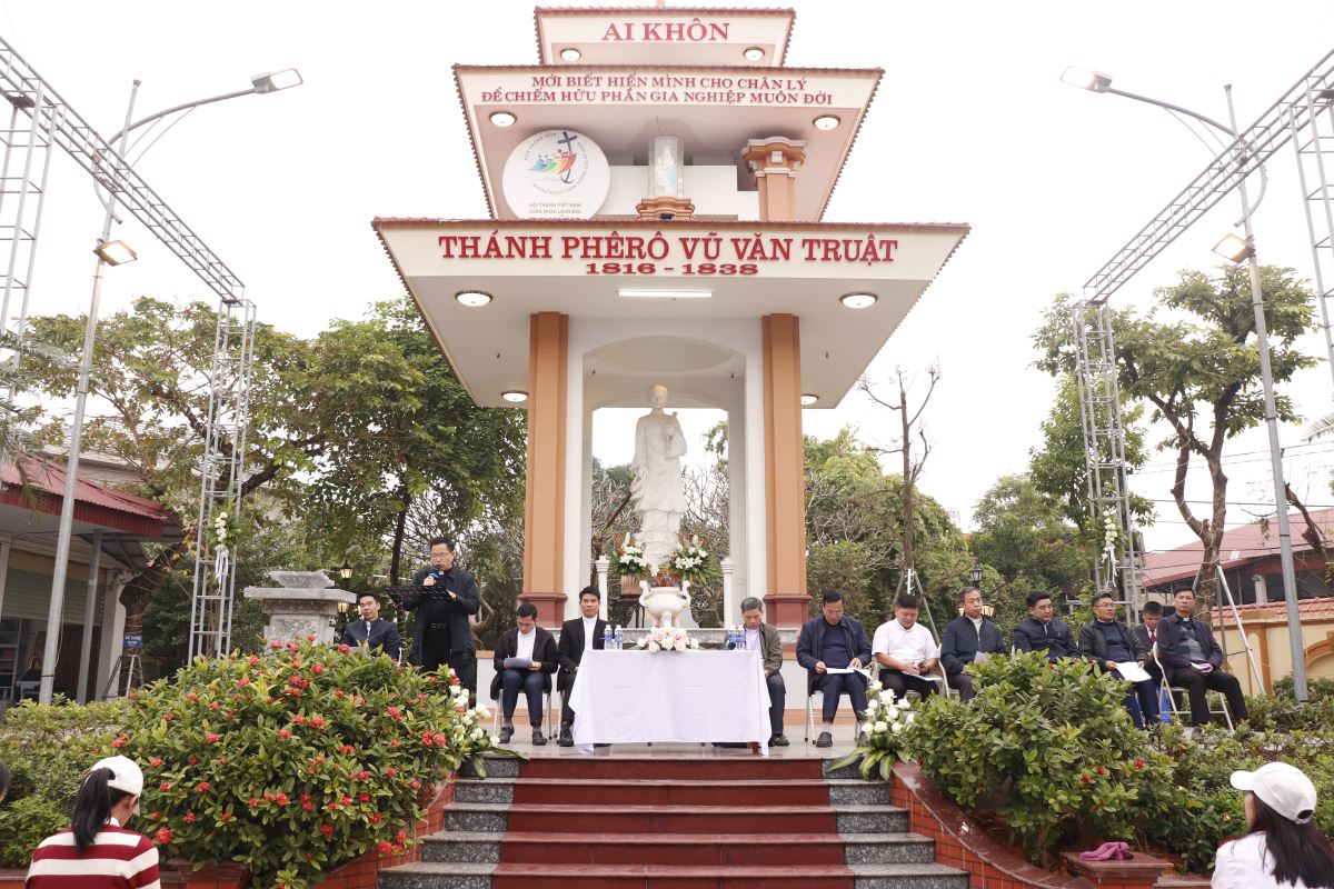 Mở đầu Thánh lễ, Đức cha mời gọi cộng đoàn cùng chiêm ngắm và noi gương Thánh Phêrô Vũ Văn Truật. Nhờ lời chuyển cầu của thánh nhân, xin Chúa ban cho mỗi người, cách riêng các giáo lý viên được thêm ơn trung thành và nhiệt thành trong sứ mạng đem Chúa đến cho các em thiếu nhi giữa những thách đố của xã hội hôm nay. Đức cha cũng cho biết, trong Thánh lễ này, ngài sẽ ban phép lành Tòa Thánh kèm ơn toàn xá theo sự ủy quyền của Đức cha Đaminh, Giám mục Giáo phận.