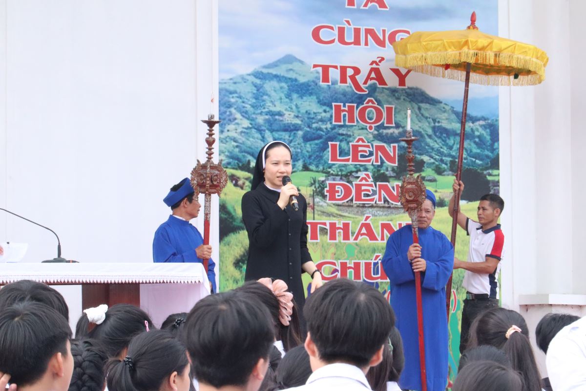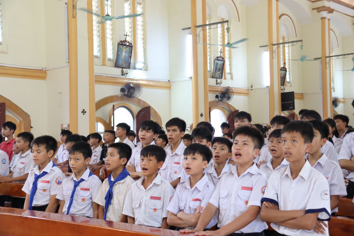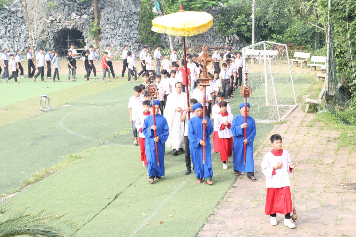 Ngay từ 7 giờ 30 phút sáng, các em đã tập trung tại sảnh nhà giáo lý để tham dự nghi thức khai mạc hành hương do Cha Giuse Nguyễn Văn Chất chủ sự, sau đó đoàn rước Thánh giá trang nghiêm tiến về nhà thờ trong bầu khí sốt sắng và trang nghiêm.