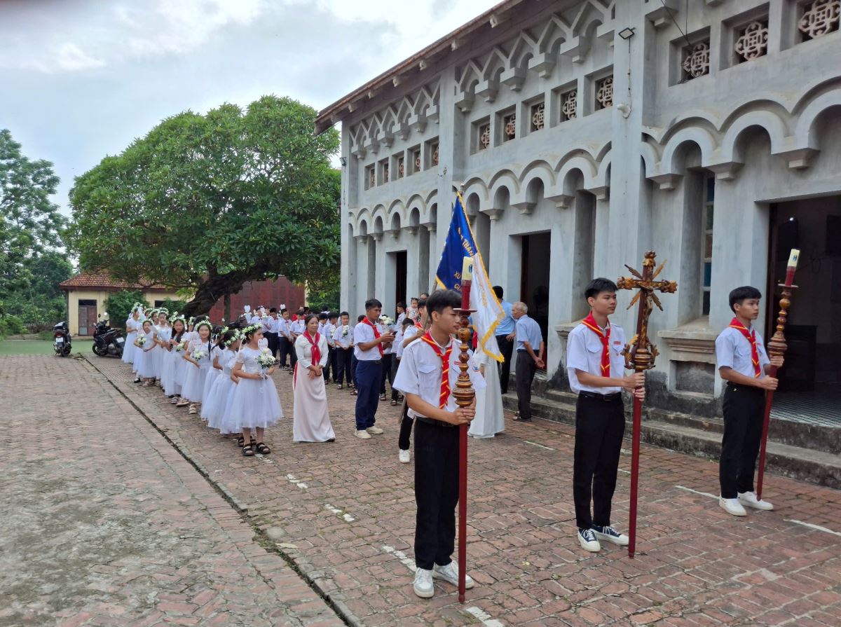 Chương trình bắt đầu lúc 07g30 với phần ổn định đội ngũ và nghi thức chào cờ, thể hiện tinh thần kỷ luật và sự trang nghiêm của các em trong ngày đặc biệt này. Sau đó, cộng đoàn cùng rước các em tiến vào nhà thờ, chuẩn bị tâm hồn để tham dự Thánh lễ.