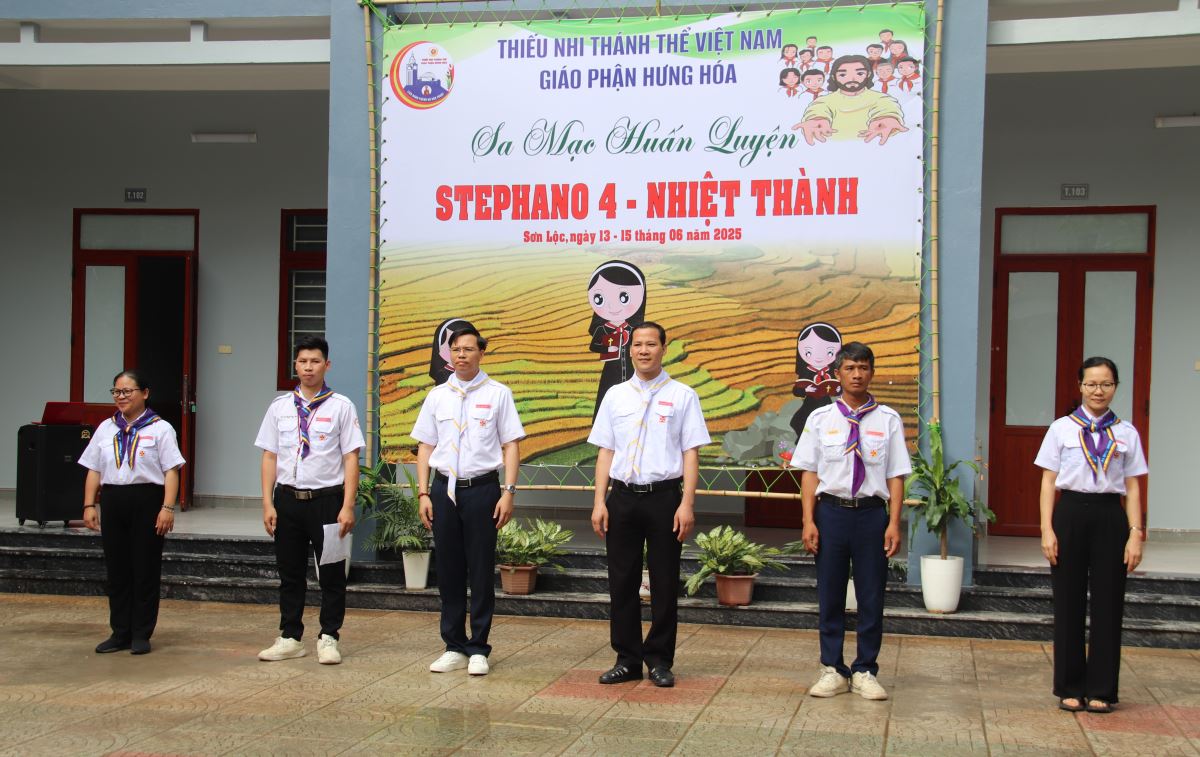 nghi thức chào cờ khai mạc trong bầu khí trang nghiêm nhưng không kém phần hứng khởi, đánh dấu khởi đầu cho hành trình ba ngày đào luyện và dấn thân. Ngọn cờ Thiếu Nhi Thánh Thể tung bay như khơi dậy tinh thần sẵn sàng, kỷ luật và hiệp nhất nơi mỗi sa mạc sinh.