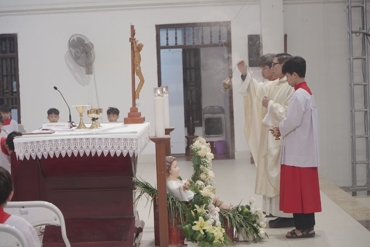 Đồng tế trong Thánh lễ có Cha bản hương Giuse Hoàng Trọng Tuấn. Hiệp dâng Thánh lễ có quý Dì Cộng đoàn Mến Thánh Giá Hoàng Xá, các hội viên Hội Kim Ngọc Khánh, cùng đông đảo cộng đoàn tín hữu trong giáo xứ.