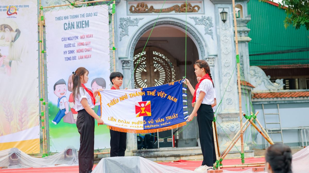 Nghi thức chào cờ được cử hành trang nghiêm, mở đầu cho chuỗi hoạt động sôi nổi. Cha xứ Giuse Nguyễn Trung Thông nhắn nhủ các em hãy sống tinh thần Thiếu Nhi Thánh Thể không chỉ hôm nay, nhưng trong hết các ngày sau này.