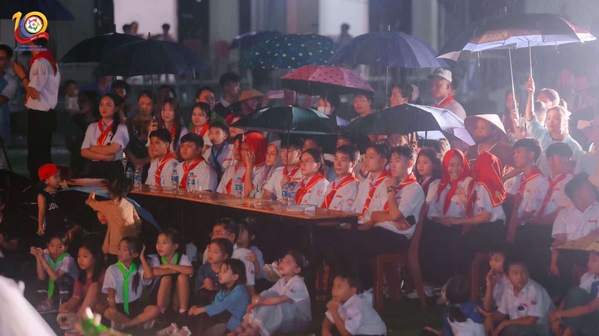 Buổi tối, mưa vẫn rơi nhưng không thể dập tắt ngọn lửa sân khấu. Các tiết mục văn nghệ do chính các em thiếu nhi và huynh trưởng dàn dựng đã mang lại những giây phút bùng nổ. Đặc biệt, sự hiện diện chúc mừng của Liên đoàn, Hiệp đoàn, các Xứ đoàn bạn, cùng các anh chị cựu huynh trưởng đã làm ngày hội thêm trọn vẹn.