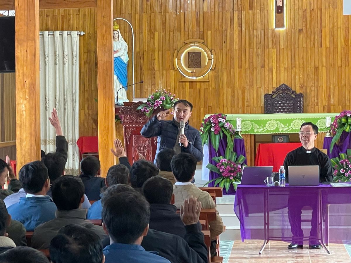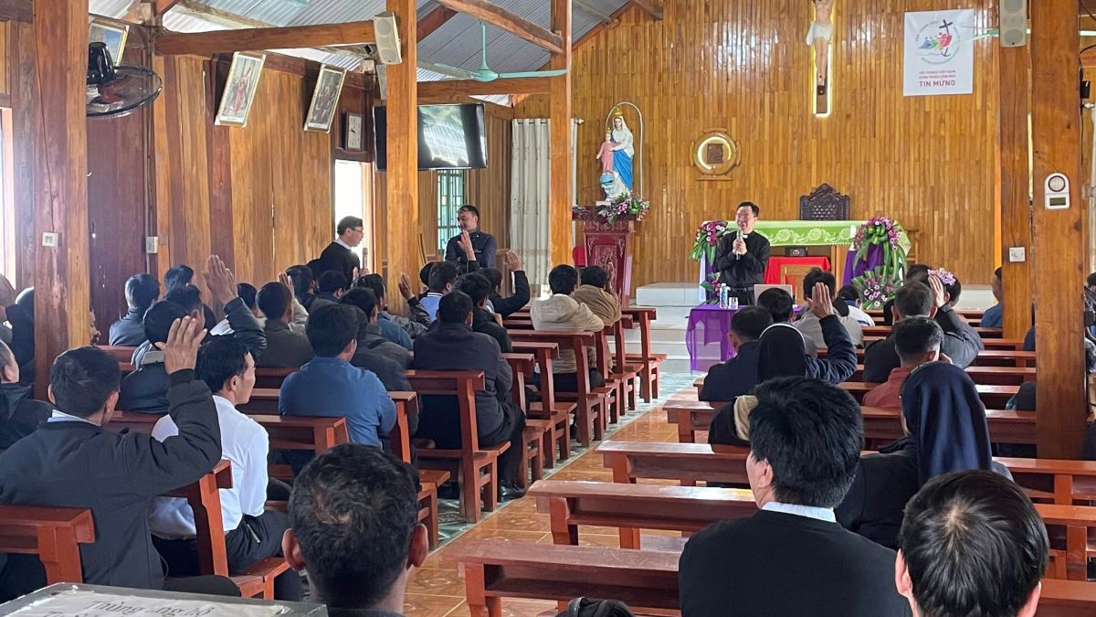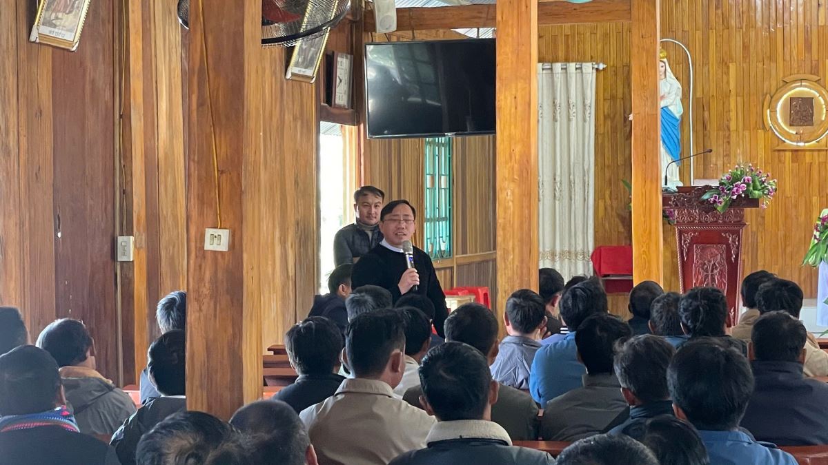 Ngay sau đó, ngài có giờ chia sẻ với cộng đoàn. Trước hết, ngài giúp mọi người ôn lại ba công việc đã được giao trong cuộc gặp mặt trước tại giáo xứ Giàng La Pán. Tiếp đến, ngài triển khai ba câu hỏi nền tảng về sứ vụ tông đồ, đó là: - Ai sai chúng ta đi? – Chính Chúa qua Giáo Hội.