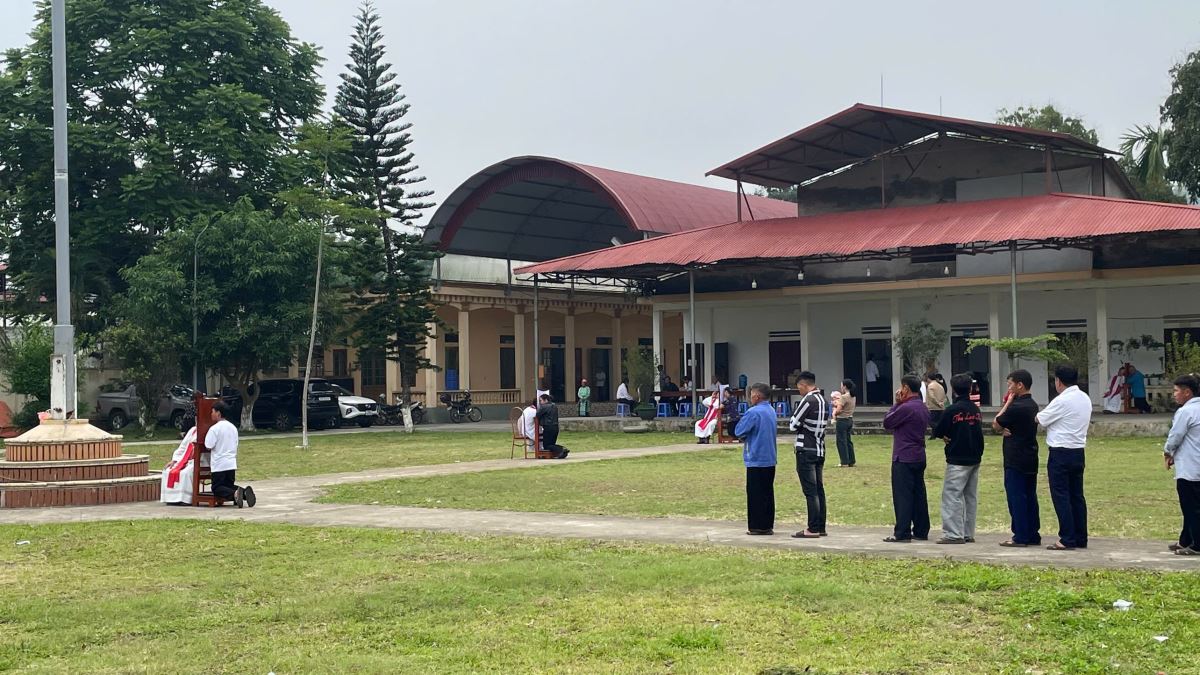 Từ lúc 07g45 đến 08g15: quý Cha, quý Thầy, quý Dì và giáo dân của giáo xứ Phình Hồ khởi sự hành hương từ lễ đài rồi tiến vào nhà thờ.