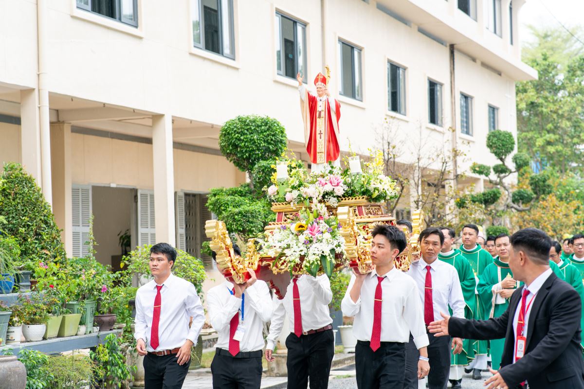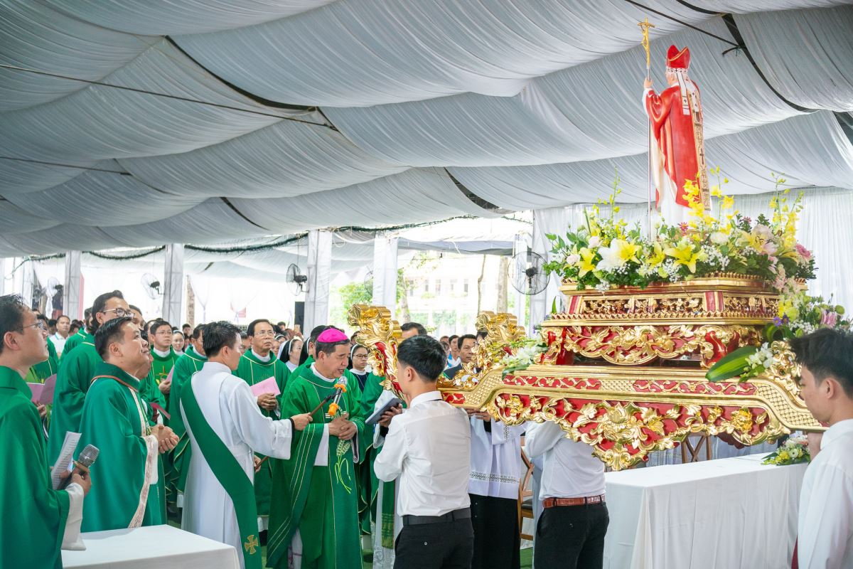 Đến 10 giờ 15 phút, Đức cha Đaminh làm phép tượng thánh Gioan Phaolô II – quan thầy của cộng đoàn di dân, và chủ sư nghi thức rước kiệu.