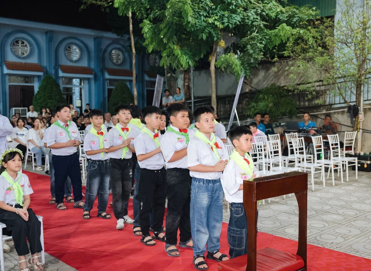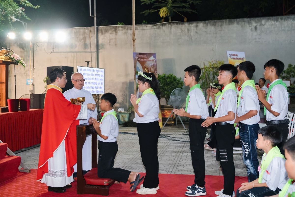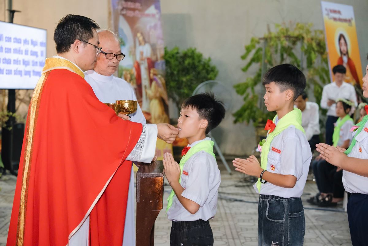 Đồng thời, hôm nay cũng là ngày ghi dấu một chặng đường thiêng liêng trong đời sống đức tin của 27 em thiếu nhi được Rước Chúa lần đầu. Đây không chỉ là niềm vui hân hoan, mà còn là bước trưởng thành trong hành trình đức tin của các em, mở ra cánh cửa để các em kết hiệp mật thiết hơn với Chúa Giêsu Thánh Thể.