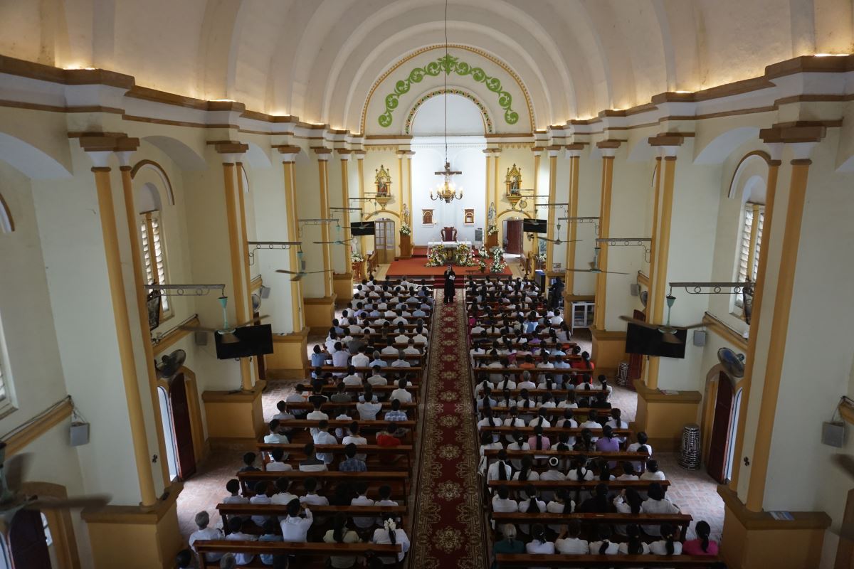 Đoàn hành hương bước theo Thánh giá tiến vào nhà thờ |