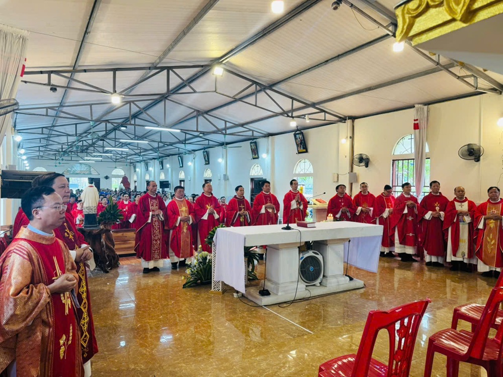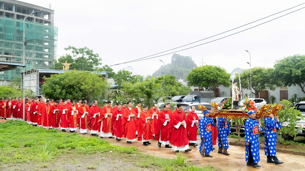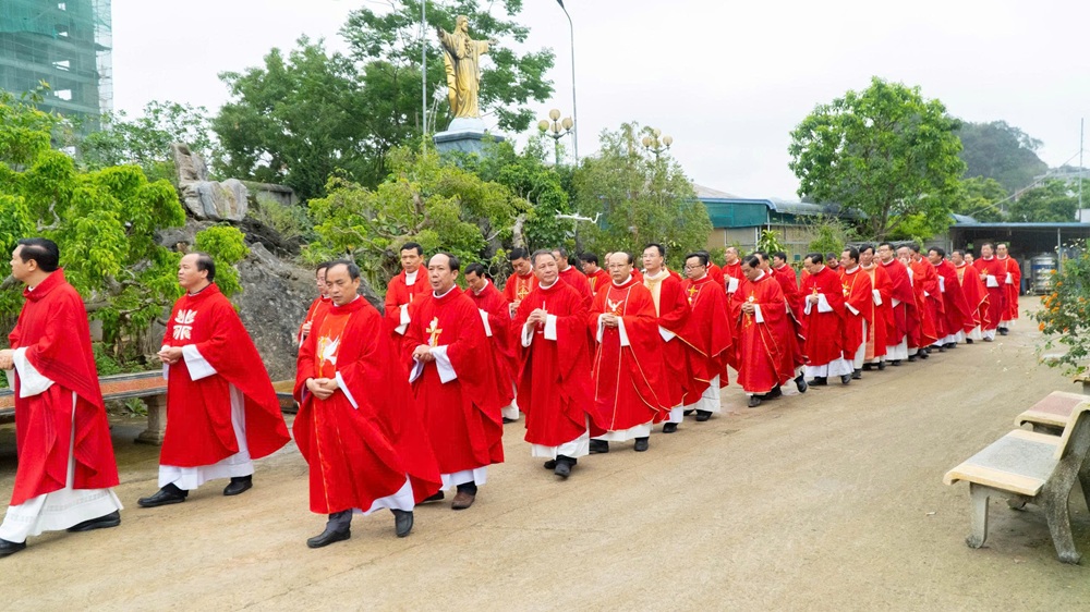 Dưới sự hướng dẫn của Ban Phụng tự, đoàn rước bắt đầu từ quảng trường giáo xứ tiến vào nhà thờ. Đây không chỉ là một nghi thức trang trọng, mà còn diễn tả sự hiệp thông huynh đệ của anh em linh mục đến từ bảy giáo phận trong tiếng kèn, tiếng trống và lời ca tiếng hát của cộng đoàn phụng vụ.
