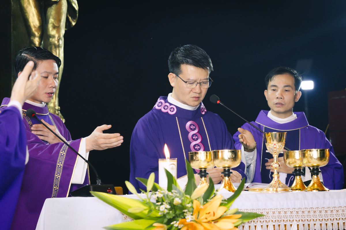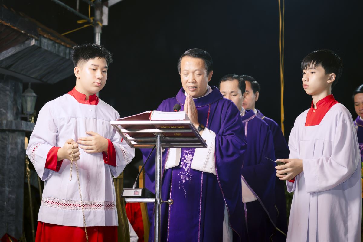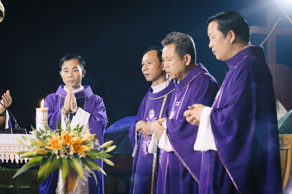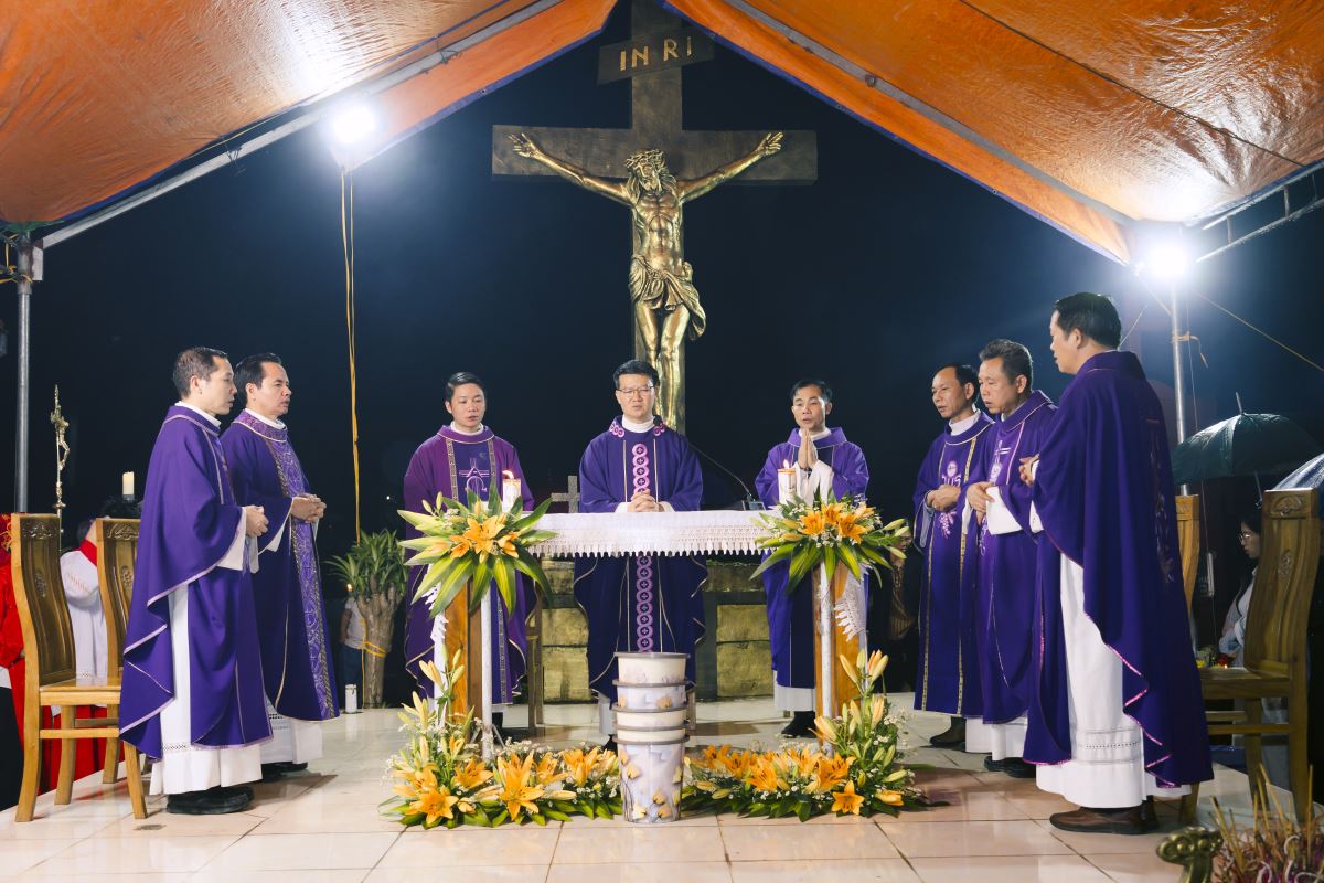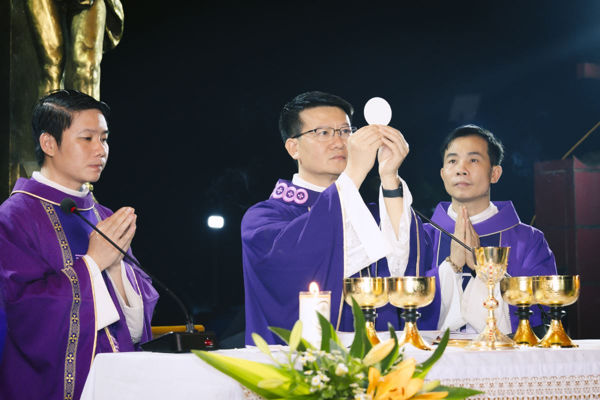 Đúng 19g00, đoàn rước đoàn đồng tế từ nhà thờ ra Vườn thánh trong tiếng trống hòa tiếng kèn đồng âm vang. Quý cha tiến lên lễ đài trong lời ca nhập lễ đầy tín thác: “Tôi tin rằng Đấng Cứu Chuộc tôi hằng sống và ngày tận thế tôi sẽ từ bụi đất sống lại và trong thân thể này tôi sẽ được chiêm ngưỡng Đấng Cứu Chuộc tôi”.