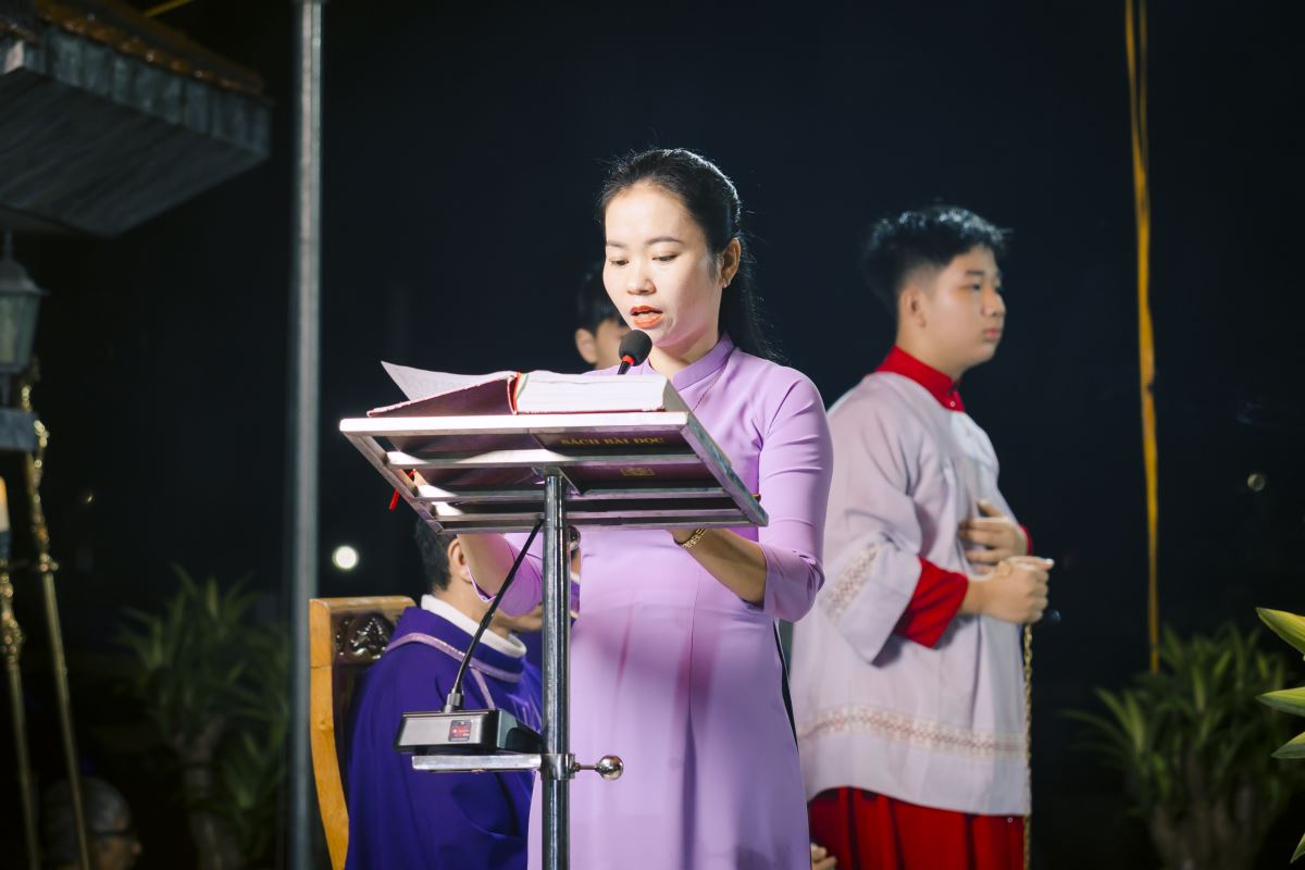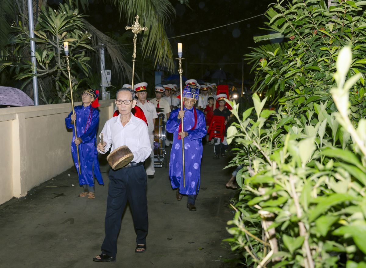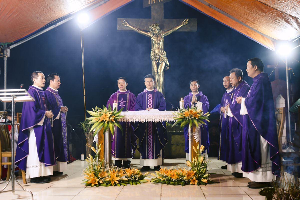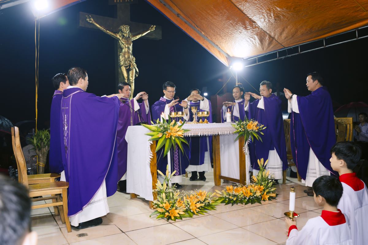 Đúng 19g00, đoàn rước đoàn đồng tế từ nhà thờ ra Vườn thánh trong tiếng trống hòa tiếng kèn đồng âm vang. Quý cha tiến lên lễ đài trong lời ca nhập lễ đầy tín thác: “Tôi tin rằng Đấng Cứu Chuộc tôi hằng sống và ngày tận thế tôi sẽ từ bụi đất sống lại và trong thân thể này tôi sẽ được chiêm ngưỡng Đấng Cứu Chuộc tôi”.