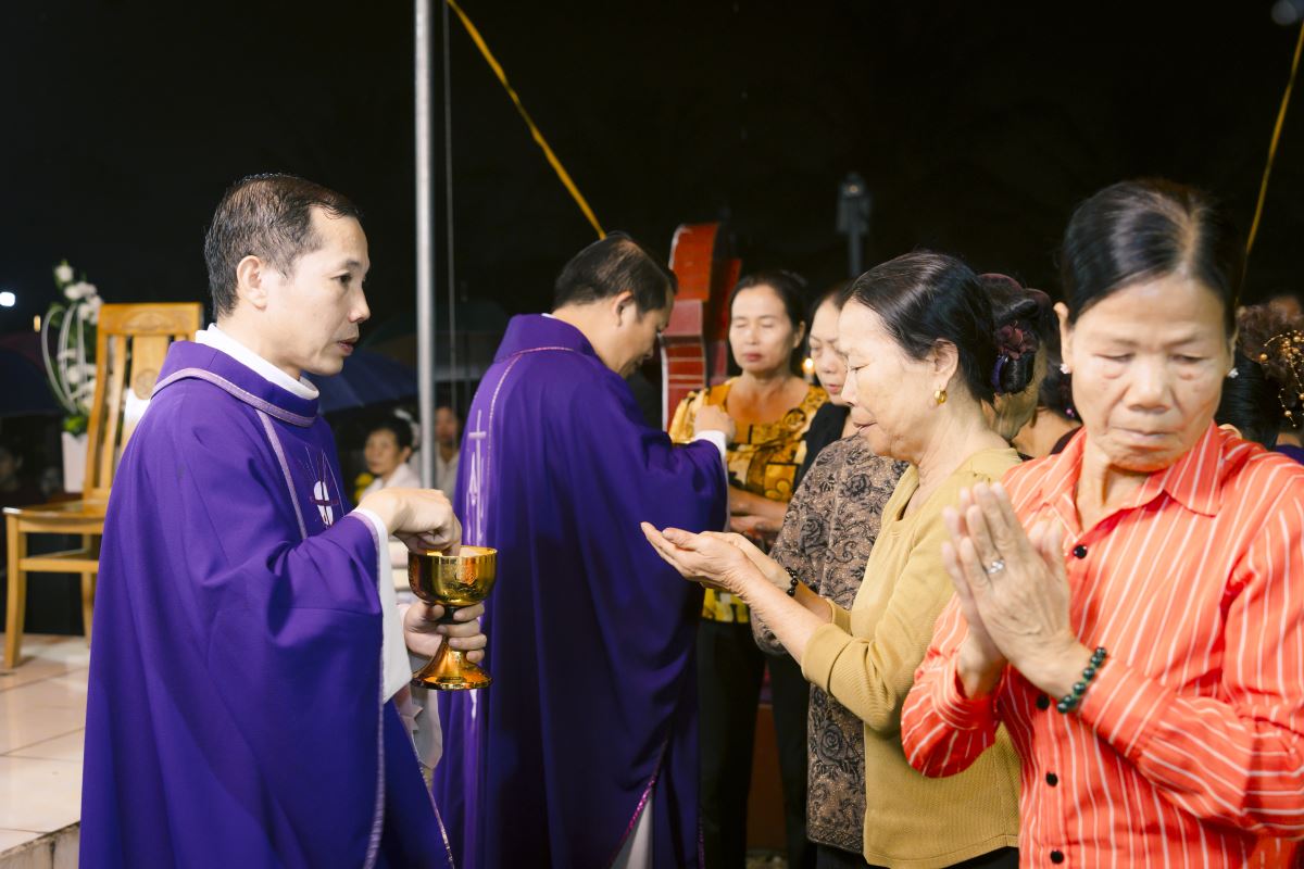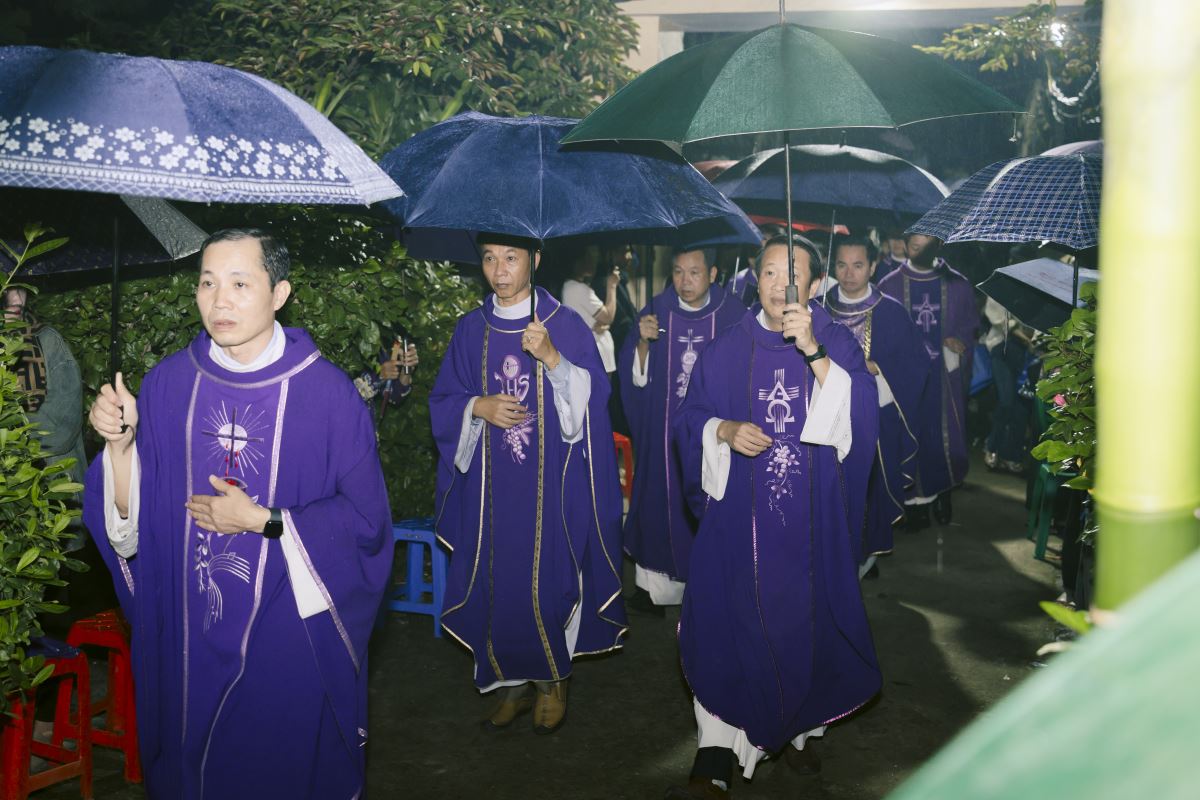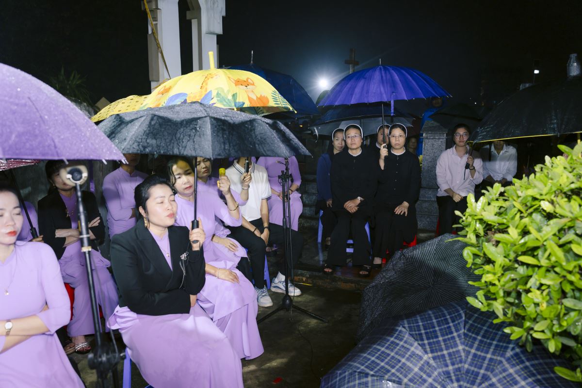 Trước giờ lễ, mưa bay lất phất, nhưng rồi mỗi lúc mưa càng nặng hạt hơn, những nén nhang, ánh nến cứ leo lét dần rồi tắt lịm trong cơn mưa rả rích, nhưng lòng cộng đoàn tham dự Thánh lễ vẫn sáng lên niềm hy vọng vào Lòng Chúa Thương Xót của Chúa, sẽ chiếu soi ánh sáng ngàn thu trên linh hồn những người thân của mình.