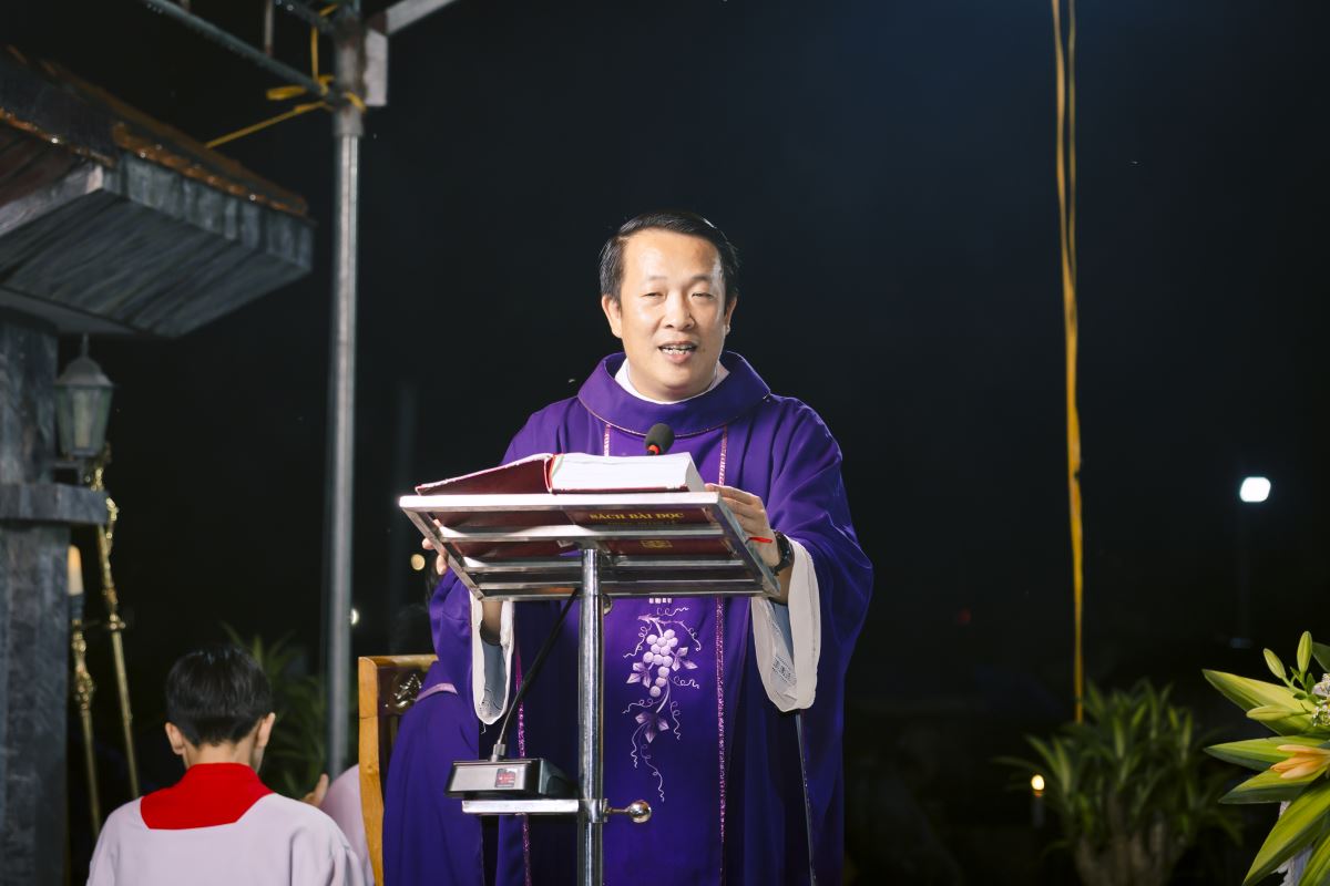 Khởi đi từ bài Tin Mừng, cha Phêrô Trần Văn Hương chia sẻ: Có lẽ trong lúc này, tổ tiên, ông bà, cha mẹ của chúng ta đang rất cảm động, vì chúng ta đang ngồi dưới trời mưa, bên phần mộ những người thân của mình, để tham dự Thánh lễ và cầu nguyện cho các ngài. Ngoài những việc chúng ta đã làm và đang làm, chúng ta hãy làm tốt hơn nữa, để việc báo hiếu của chúng ta đẹp lòng Chúa và sinh ích cho tổ tiên, ông bà, cha mẹ và những người thân yêu, đó là báo hiếu bằng chính đời sống thánh thiện của chúng ta. Chúng ta xin lễ, cầu nguyện hằng ngày, nhất là hôm nay. Chúng ta chưng hoa, thắp hương, đốt nến trên những phần mộ của người thân. Nhưng những việc làm ấy nếu không gắn liền với đời sống thánh thiện, thì chưa đạt được như ý Chúa muốn. Sống thánh thiện, trên hết, chúng ta phải sống trung thành với Chúa, trong bối cảnh xã hội ngày nay, có rất nhiều các bè phái khác đang lôi kéo chúng ta xa Chúa, những hội nhóm ấy đang xô đẩy con cái của Chúa. Nếu chúng ta không trung thành với Chúa, thì ông bà tổ tiên của chúng ta sẽ rất buồn và việc báo hiếu của chúng ta chưa đạt được điều Chúa muốn. Chúng ta hãy sống ngay lành, sống công bằng bác ái, sống tốt với nhau, cha mẹ dạy bảo con cháu những điều tốt đẹp, con cháu vâng lời hiếu thảo, anh chị em sống yêu thương đùm bọc, vợ chồng chung thủy với nhau. Phần thưởng đẹp nhất mà chúng ta báo hiếu tổ tiên, ông bà, cha mẹ, đó là chúng ta sống cuộc đời thánh thiện.