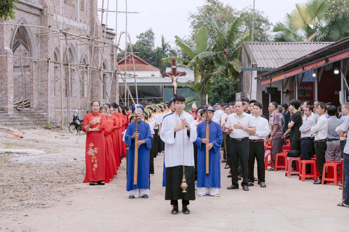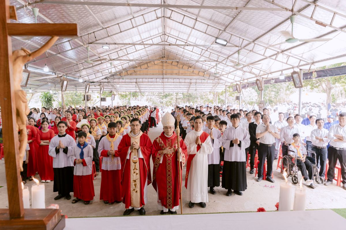 Đến 8 giờ 30 phút, Thánh lễ do Đức Cha Phụ tá chủ tế được long trọng cử hành. Cùng đồng tế với Đức cha, có Cha xứ Giuse Phan Văn Luật, và sự hiện diện của Thầy Phó tế Giuse Nguyễn Văn Thưởng, cùng đông đảo quý phụ huynh, ân nhân, cũng như toàn thể cộng đoàn dân Chúa.