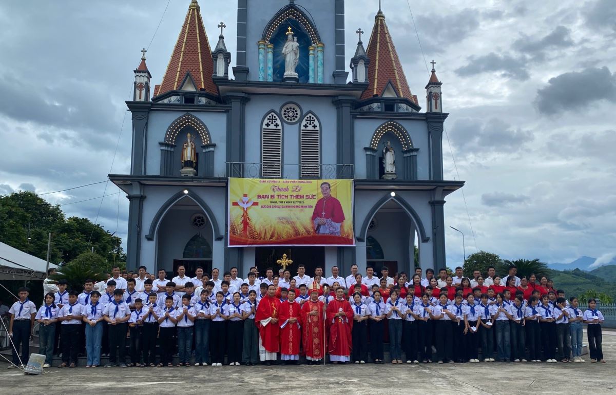 WGPHH - Chiều thứ Ba, ngày 22 tháng 7 năm 2025, cộng đoàn giáo họ Mậu A (thuộc giáo xứ Mậu Đông) hân hoan đón chào Đức cha Đaminh Hoàng Minh Tiến – Giám mục Giáo phận Hưng Hóa, về dâng Thánh lễ và ban Bí tích Thêm Sức cho 57 em thiếu nhi trong giáo xứ. Đồng tế với ngài có cha xứ Phêrô Phan Kim Huấn, cha Phêrô Phạm Thanh Bình – Quản hạt Yên Bái và cha Micae Nguyễn Tiến Quang – Quản xứ Nhân Nghĩa.