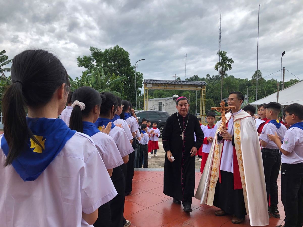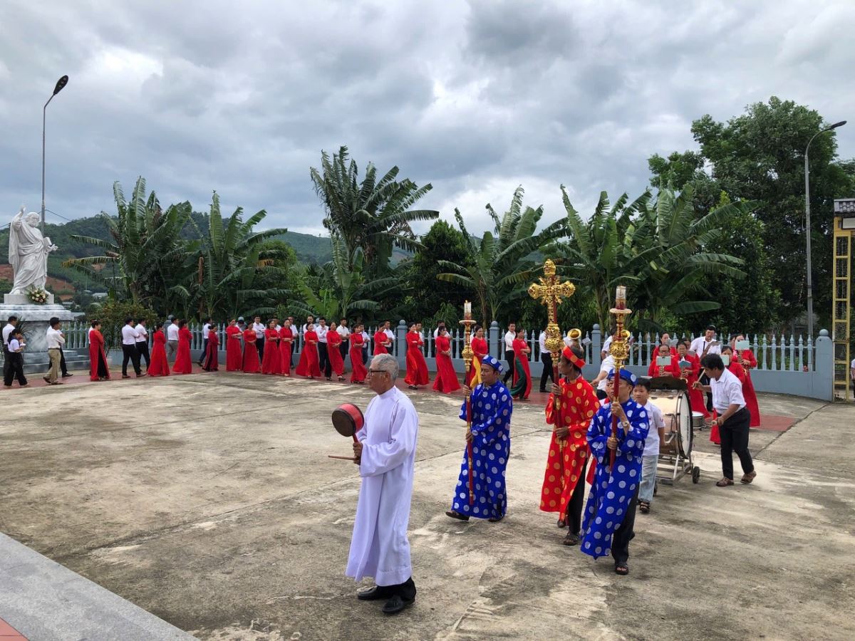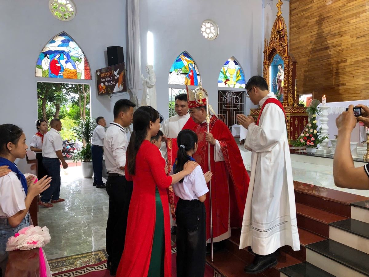 Trước đó, cha xứ Phêrô Phan Kim Huấn đã quy tụ cộng đoàn, đặc biệt là các em thiếu nhi sắp lãnh nhận Bí tích Thêm Sức, xếp thành hàng nghiêm trang trước nhà thờ để chào đón vị Chủ chăn của Giáo phận theo nghi thức đón tiếp trong các dịp thăm viếng mục vụ.