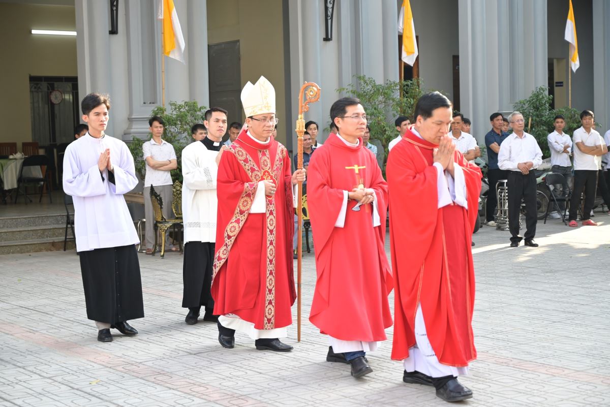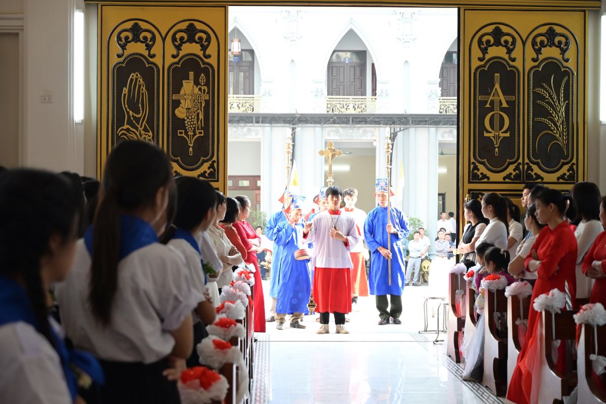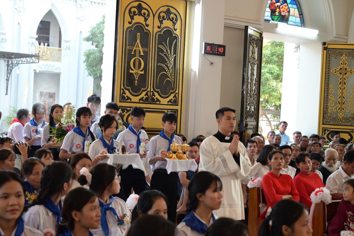 Thánh lễ được cử hành vào lúc 15h00 tại nhà thờ Giáo xứ Cát Ngòi. Thánh lễ do Đức cha Phaolô Nguyễn Quang Đĩnh – Giám mục phụ tá Giáo phận Hưng Hóa chủ tế. Đồng tế với ngài có cha xứ Đaminh Hoàng Thế Bằng, cha giáo Giuse Nguyễn Minh Hoàng, OP (Dòng Đaminh). Hiện diện trong Thánh lễ còn có quý thầy, quý dì, quý phụ huynh và đông đảo cộng đoàn dân Chúa.