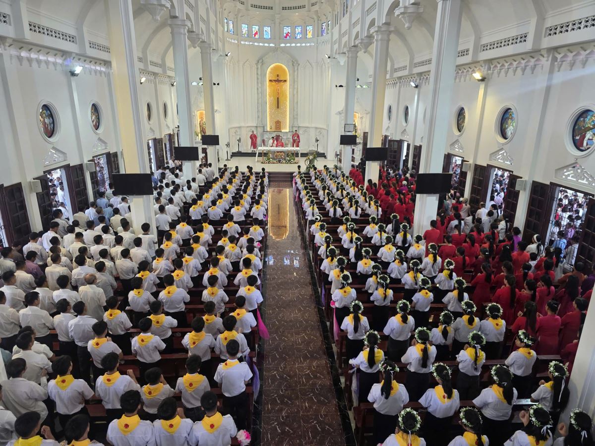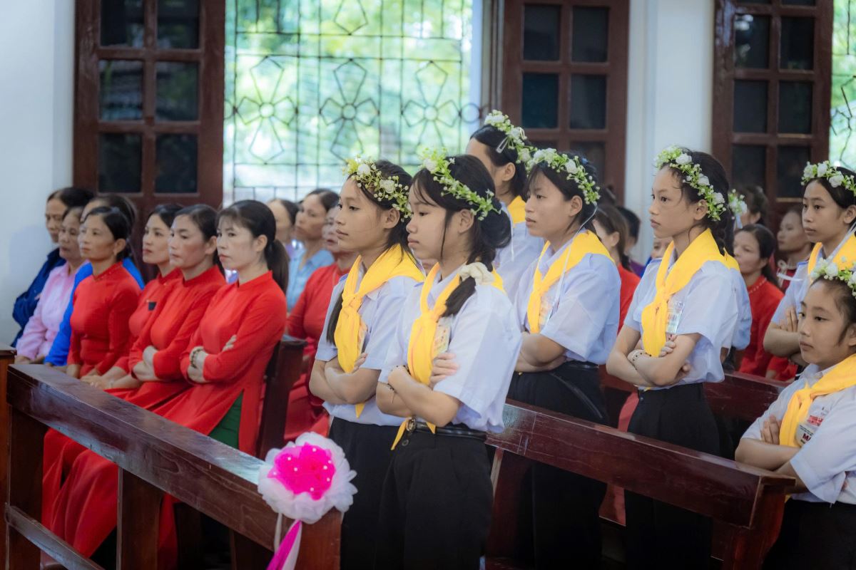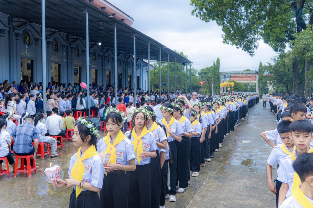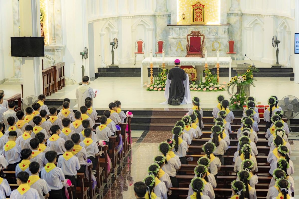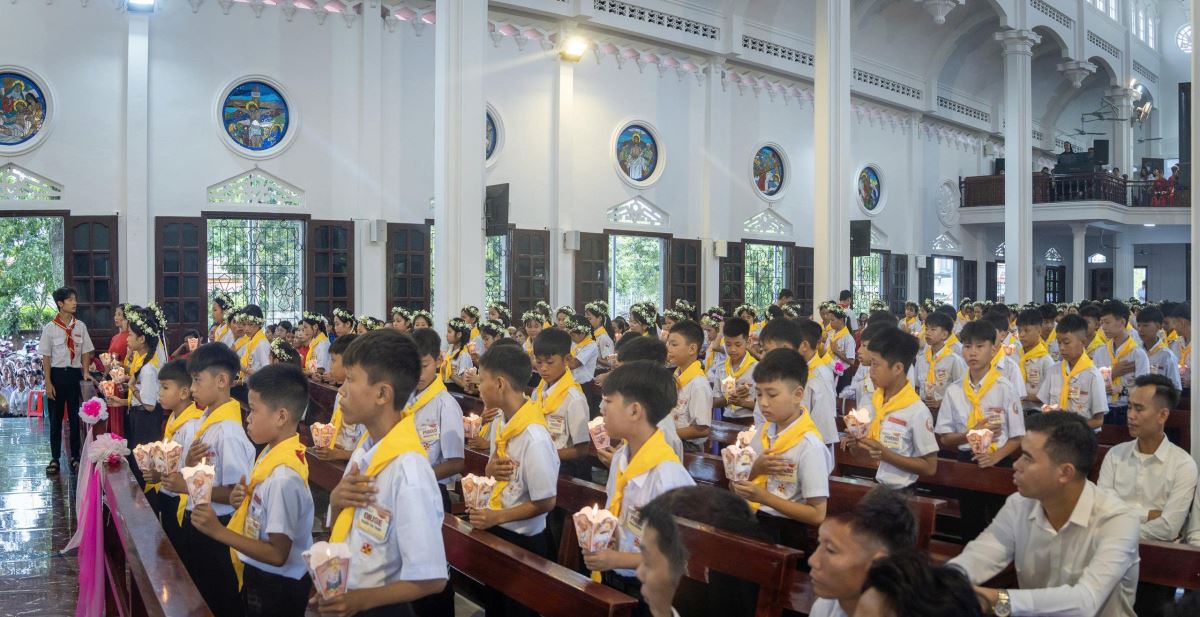 Sáng sớm Chúa Nhật, trong bầu khí trang nghiêm và rộn ràng niềm vui, các em quy tụ đông đủ tại sân nhà thờ. Khăn áo chỉnh tề, gương mặt rạng rỡ, các em háo hức chờ giây phút trọng đại.