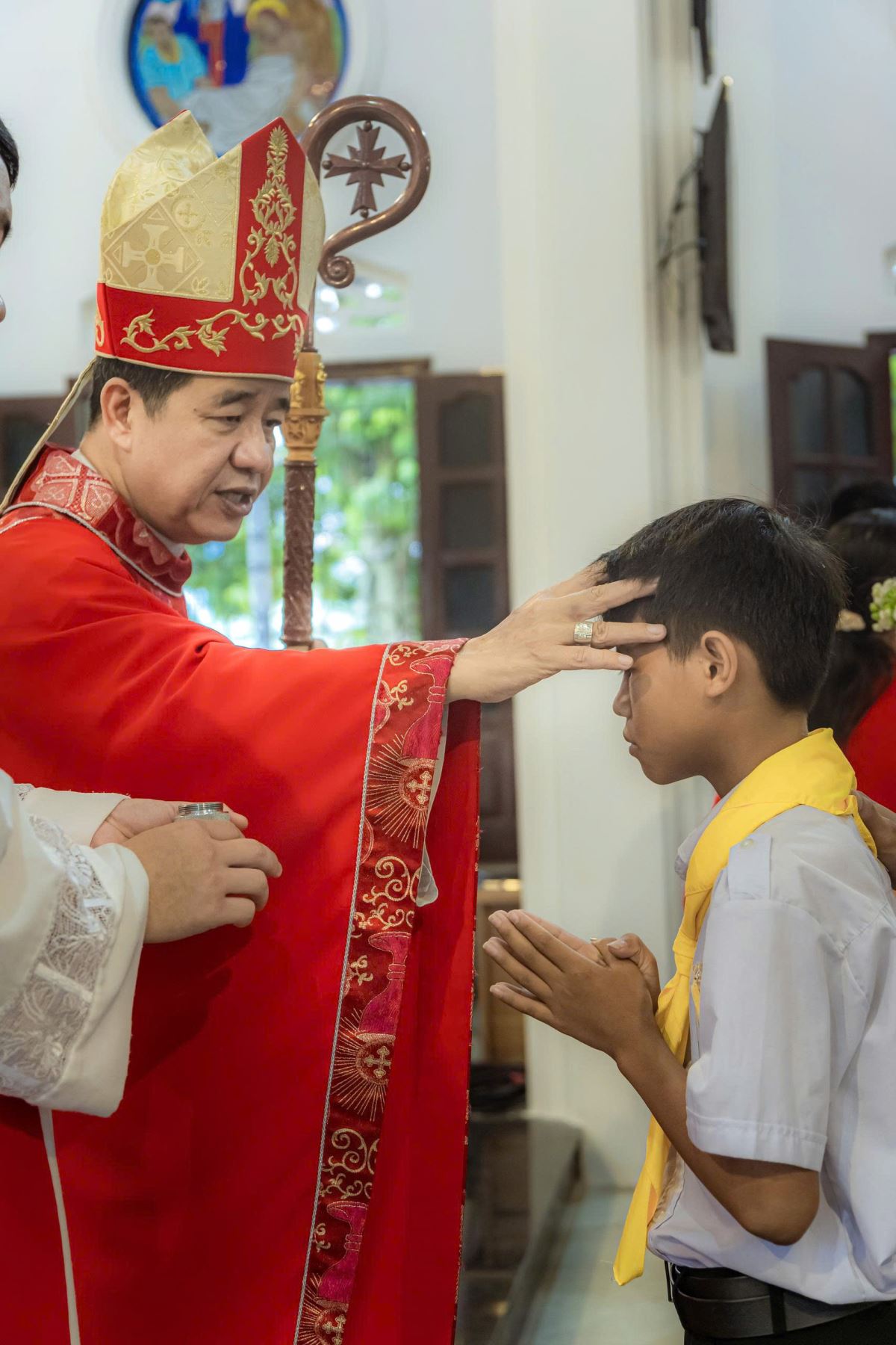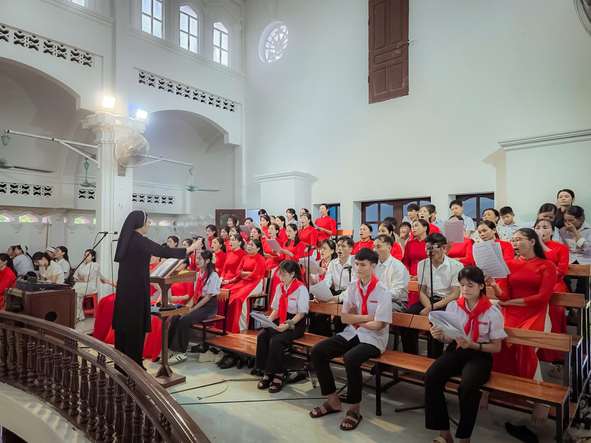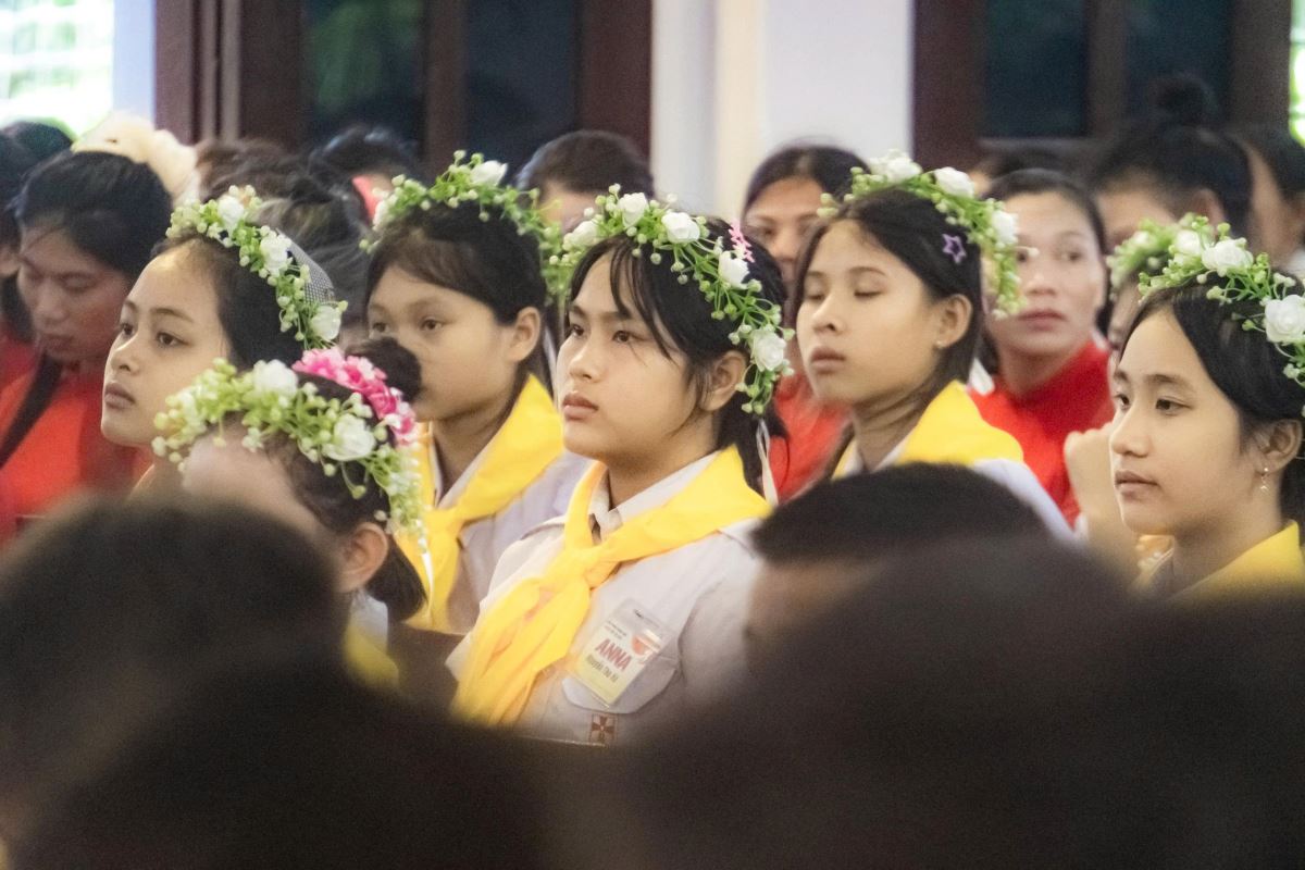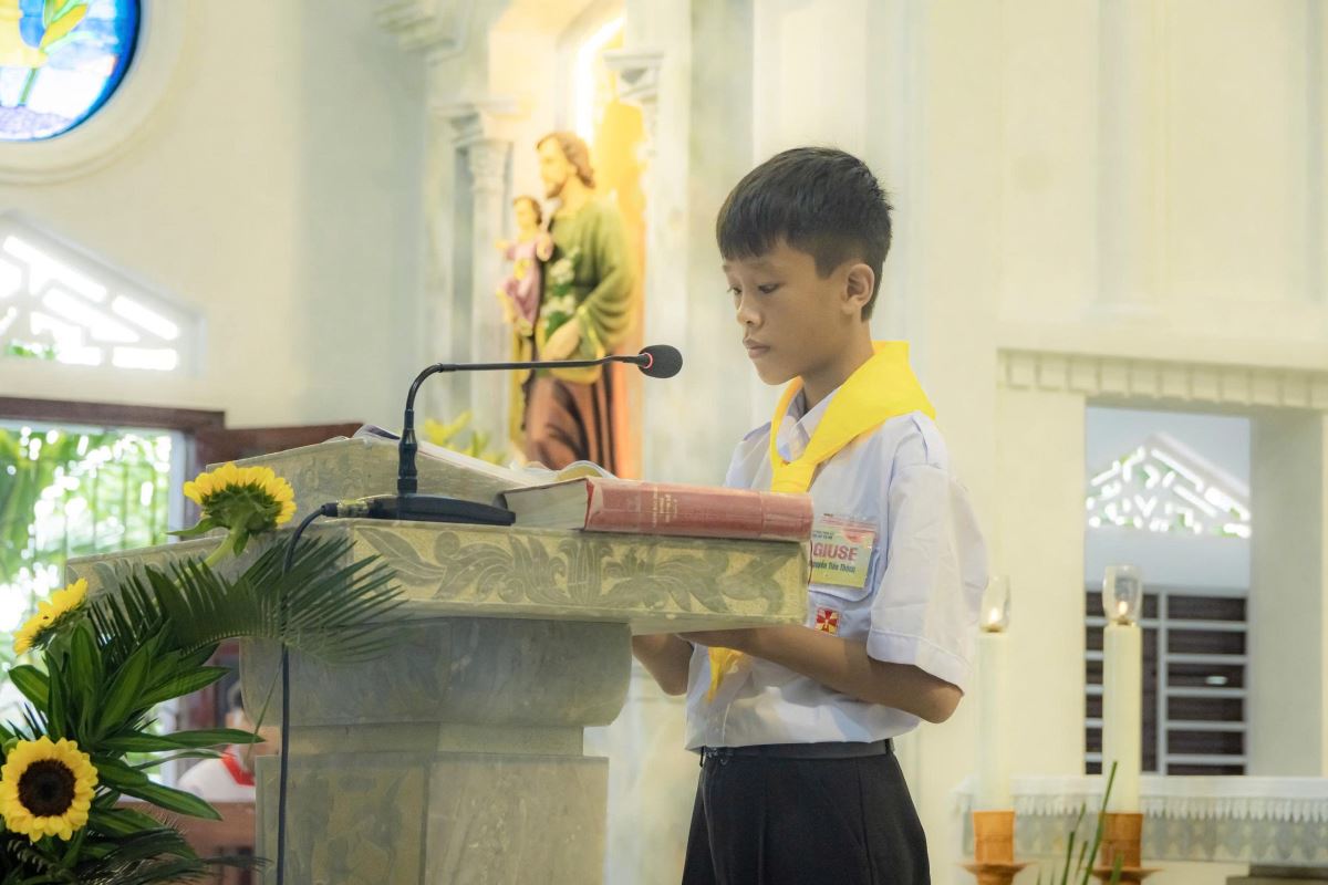 Sáng sớm Chúa Nhật, trong bầu khí trang nghiêm và rộn ràng niềm vui, các em quy tụ đông đủ tại sân nhà thờ. Khăn áo chỉnh tề, gương mặt rạng rỡ, các em háo hức chờ giây phút trọng đại.