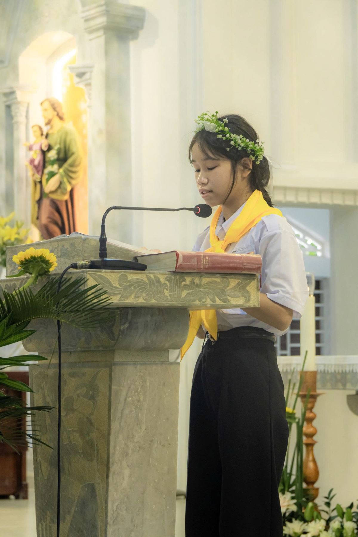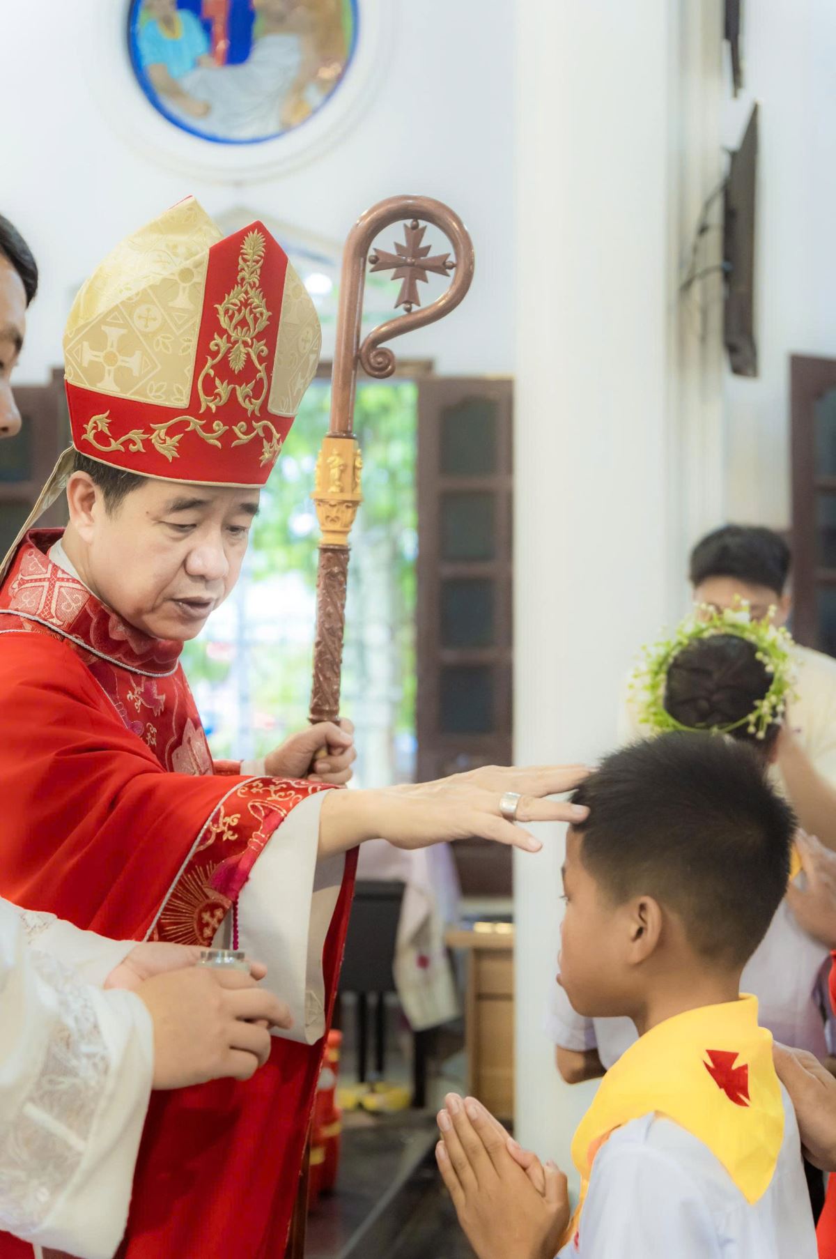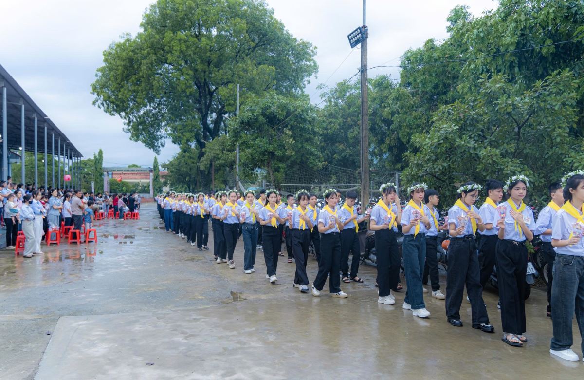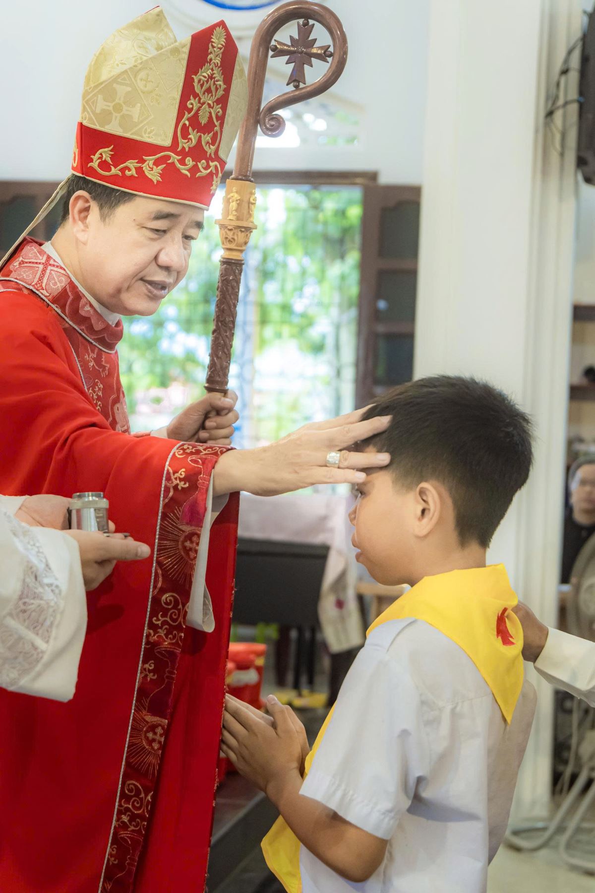 Sáng sớm Chúa Nhật, trong bầu khí trang nghiêm và rộn ràng niềm vui, các em quy tụ đông đủ tại sân nhà thờ. Khăn áo chỉnh tề, gương mặt rạng rỡ, các em háo hức chờ giây phút trọng đại.
