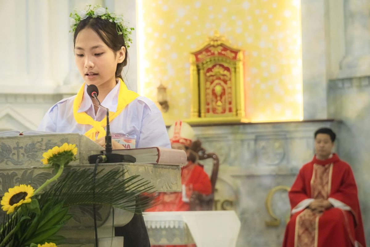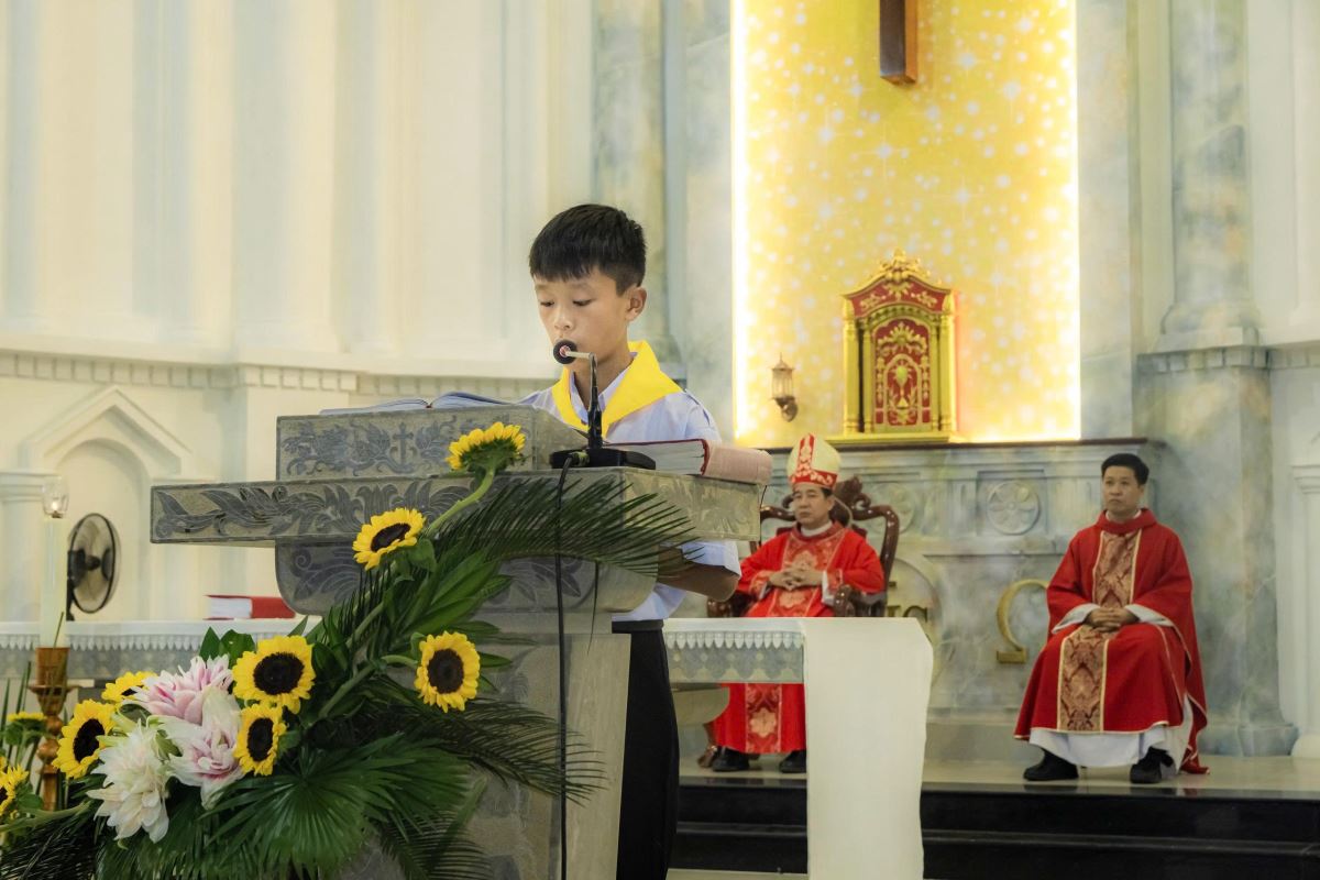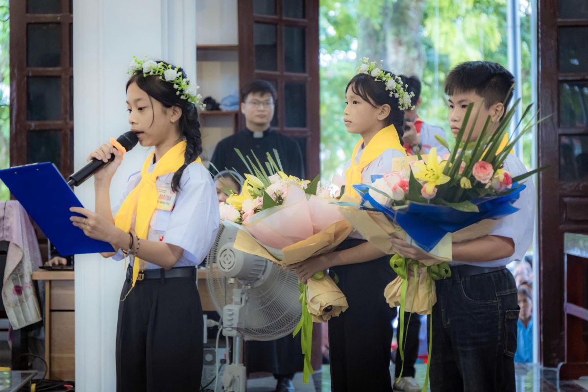 Kết thúc Thánh lễ, một em đại diện 200 em dâng lời tri ân Đức cha, quý cha, quý tu sĩ, các thầy cô giáo lý viên, các anh chị huynh trưởng cùng cha mẹ, ông bà đã đồng hành và nâng đỡ các em trong hành trình đức tin.