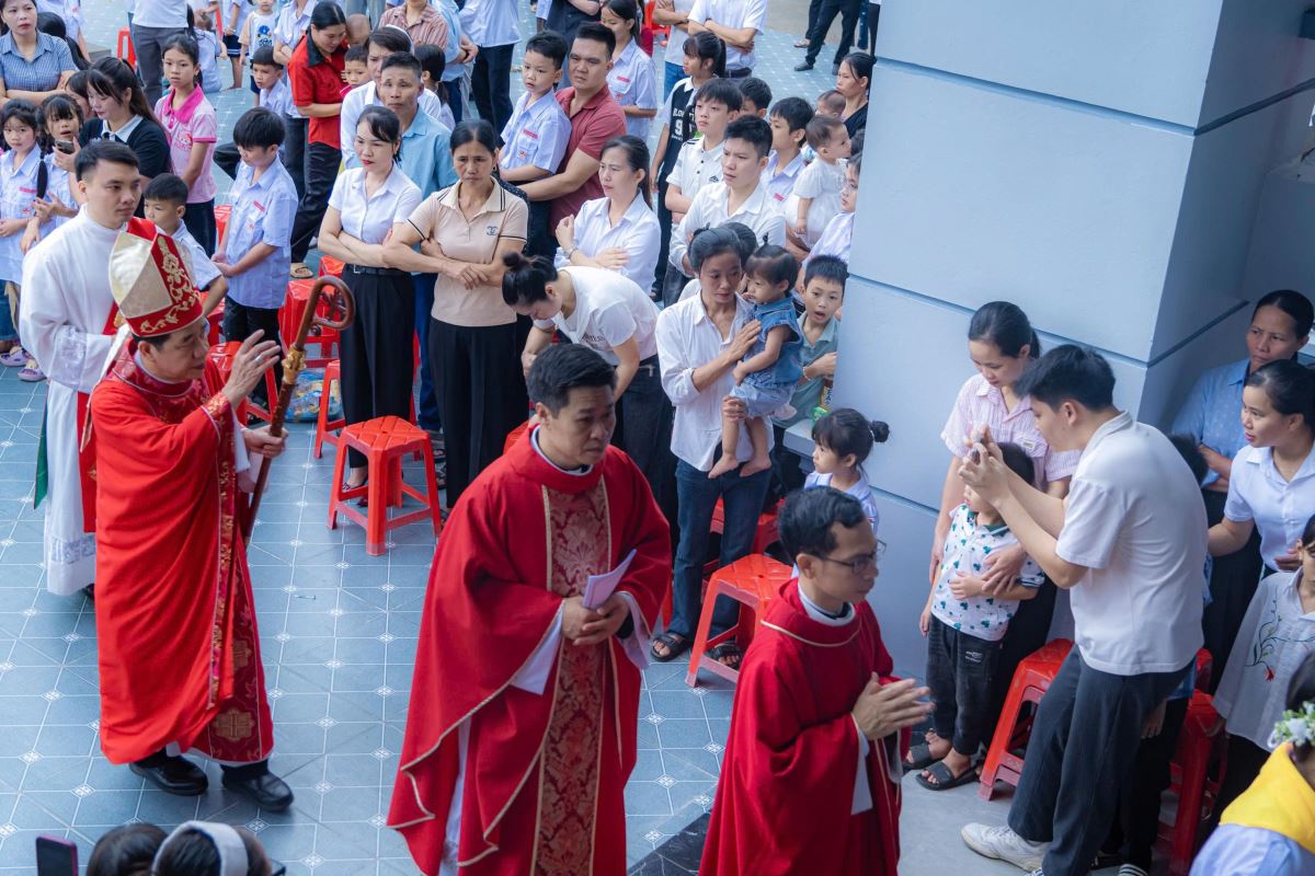 Đúng 7g00, Đức cha Đaminh Hoàng Minh Tiến – Giám mục chính tòa giáo phận Hưng Hóa đã đến trong sự hân hoan chào đón của các em và toàn thể cộng đoàn.