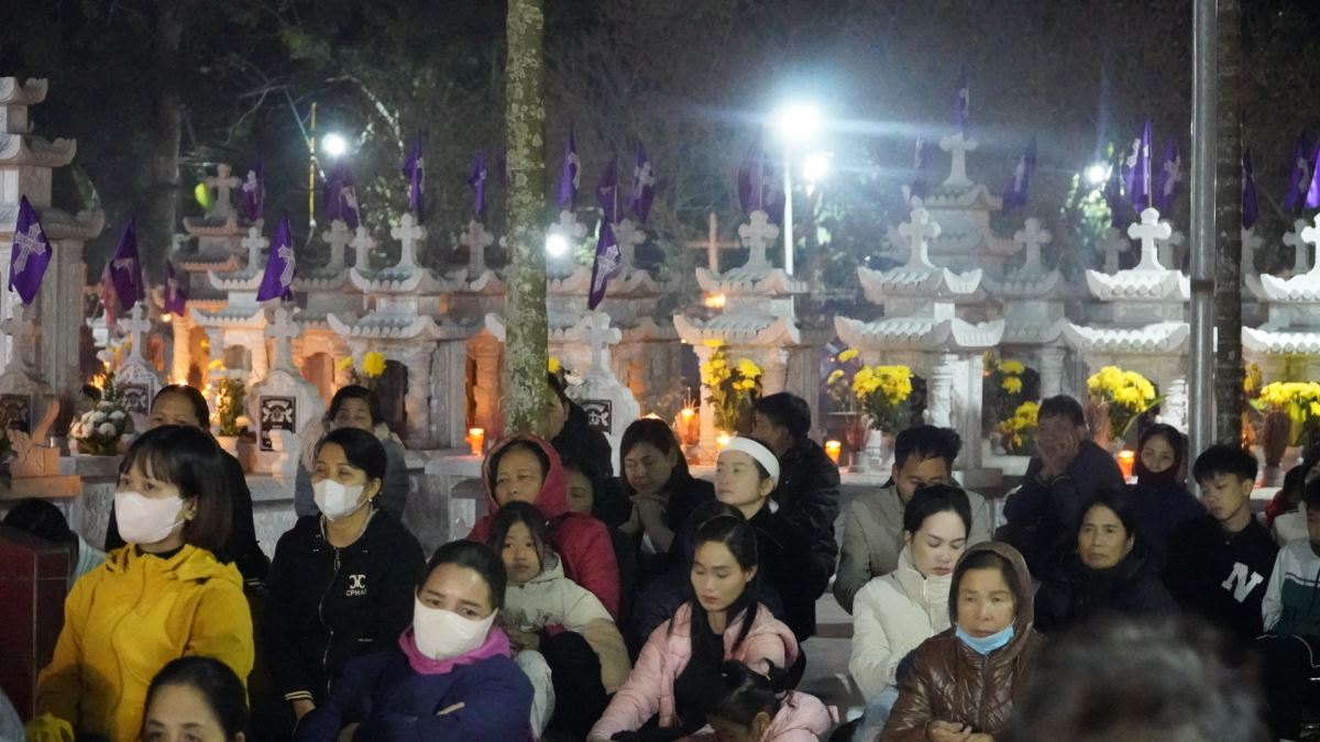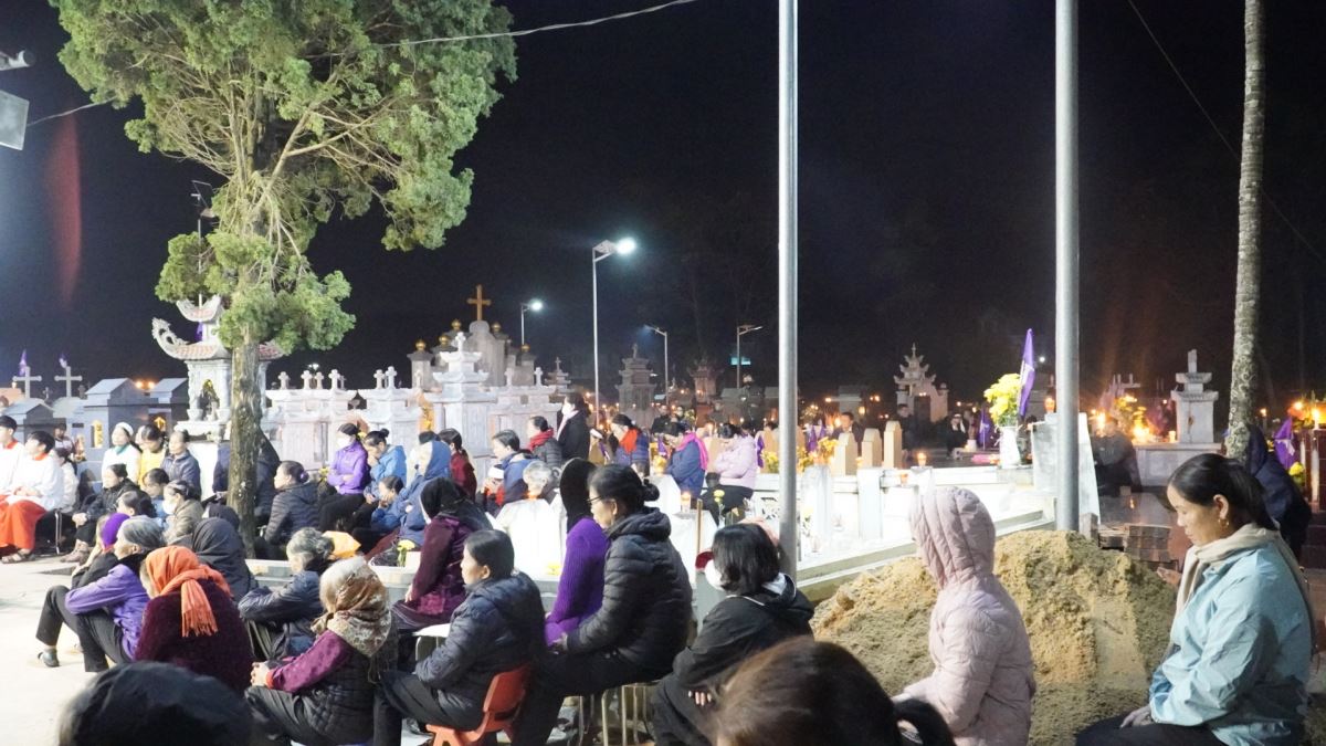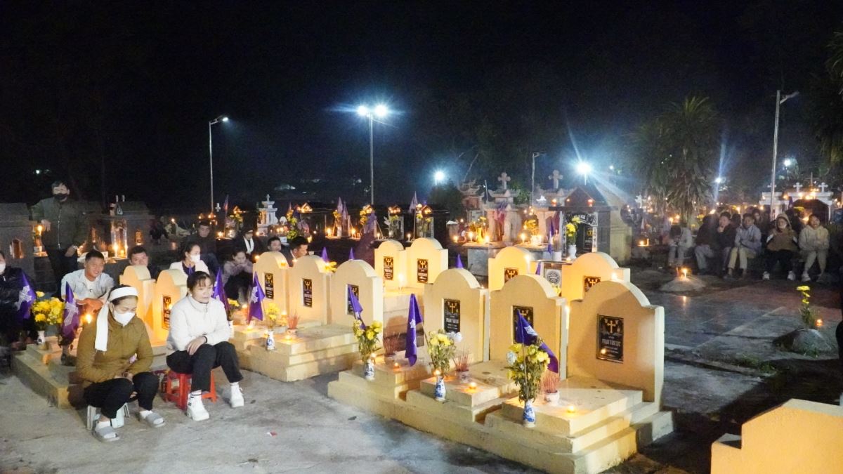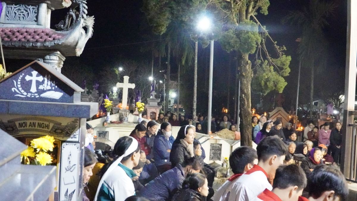 Ánh nến ấm áp từ các phần mộ hòa cùng lời kinh sốt sắng, tạo nên một không gian trang trọng và đầy tình hiệp thông. Tại đây, cộng đoàn cùng tuyên xưng niềm tin vững chắc vào sự sống lại.